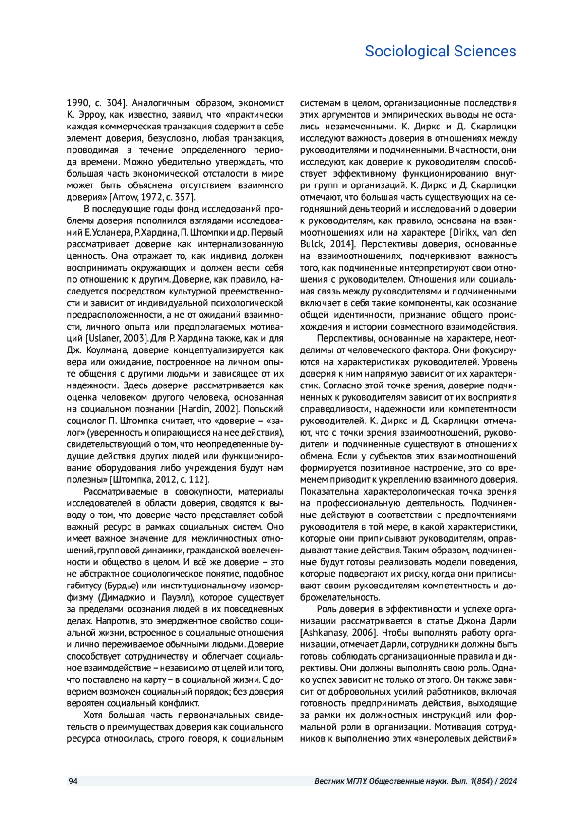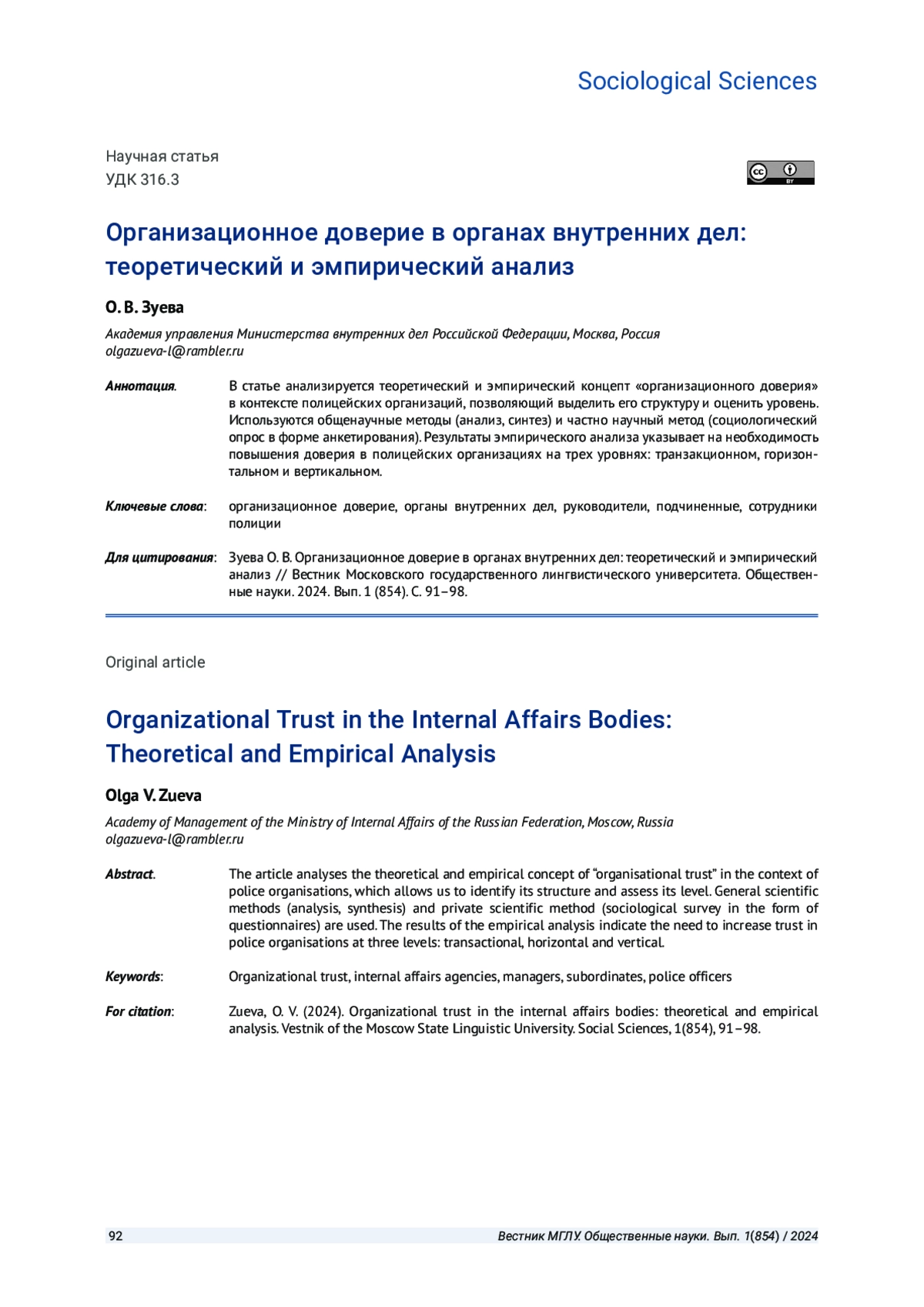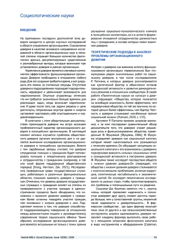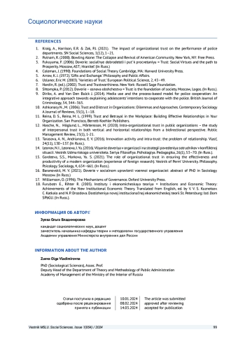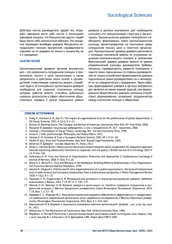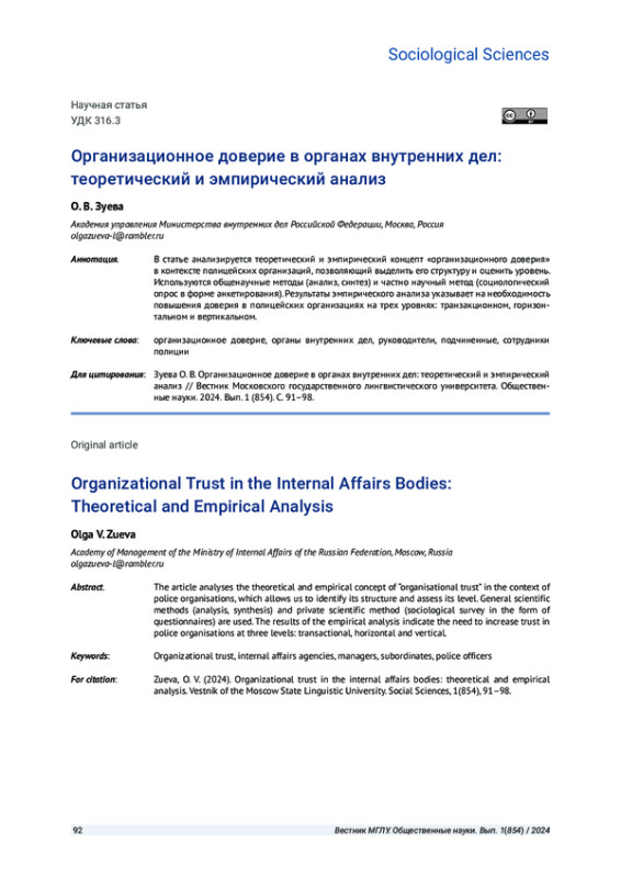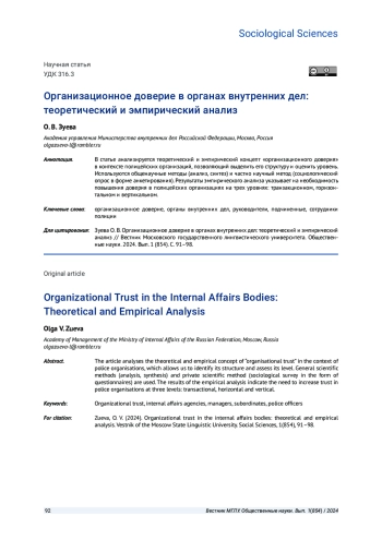 ЗУЕВА О. В. ОРГАНИЗАЦИОННОЕ ДОВЕРИЕ В ОРГАНАХ ВНУТРЕННИХ ДЕЛ: ТЕОРЕТИЧЕСКИЙ И ЭМПИРИЧЕСКИЙ АНАЛИЗ // ВЕСТНИК МОСКОВСКОГО ГОСУДАРСТВЕННОГО ЛИНГВИСТИЧЕСКОГО УНИВЕРСИТЕТА. ОБЩЕСТВЕННЫЕ НАУКИ. 2024. № 1 (854)