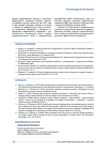 В статье на основе эмпирических данных показан сравнительный анализ представлений руководителей органов внутренних дел о критериях эффективности управления. Обнаружена и описана содержательная разница в концептуализации понимания категории «эффективное управление» руководителей двух старших поколений. Предполагается, что выявленные отличия являются следствием реформы органов внутренних дел 2011 года, в ходе которой осуществлен переход от милиции к полиции.