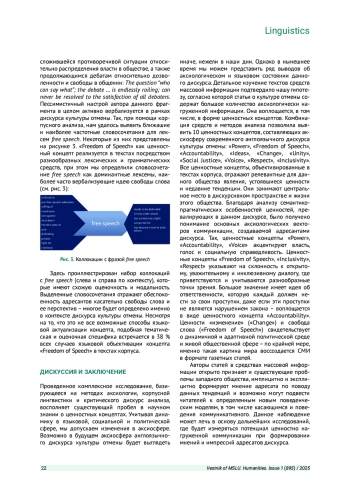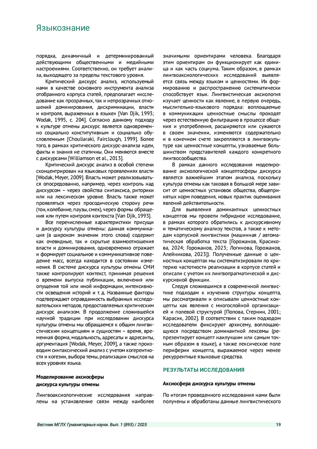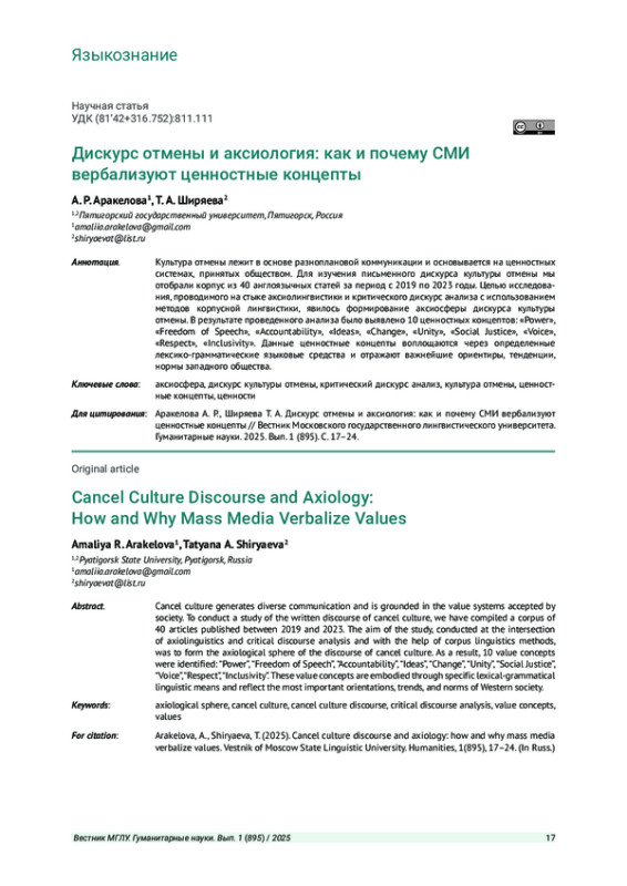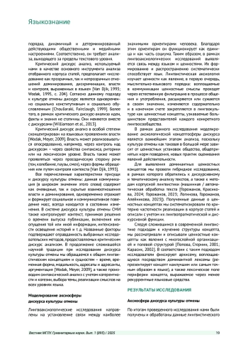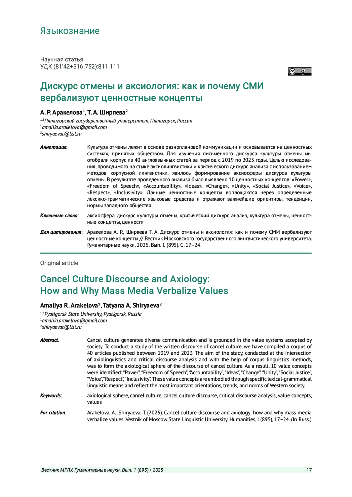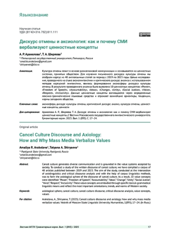Культура отмены лежит в основе разноплановой коммуникации и основывается на ценностных системах, принятых обществом. Для изучения письменного дискурса культуры отмены мы отобрали корпус из 40 англоязычных статей за период с 2019 по 2023 годы. Целью исследования, проводимого на стыке аксиолингвистики и критического дискурс анализа с использованием методов корпусной лингвистики, явилось формирование аксиосферы дискурса культуры отмены. В результате проведенного анализа было выявлено 10 ценностных концептов: «Power», «Freedom of Speech», «Accountability», «Ideas», «Change», «Unity», «Social Justice», «Voice», «Respect», «Inclusivity». Данные ценностные концепты воплощаются через определенные лексико-грамматические языковые средства и отражают важнейшие ориентиры, тенденции, нормы западного общества.
