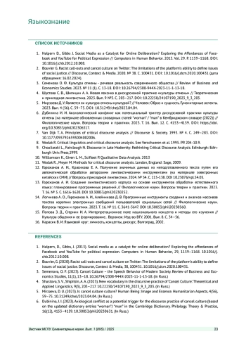 2. Bouvier G. Racist call-outs and cancel culture on Twitter: The limitations of the platform’s ability to define issues of social justice // Discourse, Context & Media. 2020. № 38. С. 100431. 10.1016/j.dcm.2020.100431 (дата обращения: 16.02.2024). DOI: 10.1016/j.dcm.2020.100431( EDN: CHCBVR
