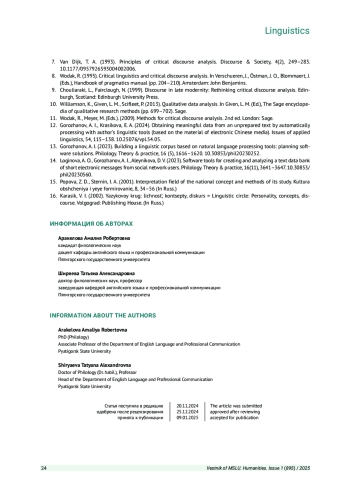 7. Van Dijk T. A. Principles of critical discourse analysis // Discourse & Society. 1993. № 4. С. 249-283. DOI: 10.1177/0957926593004002006 EDN: JRJXUB