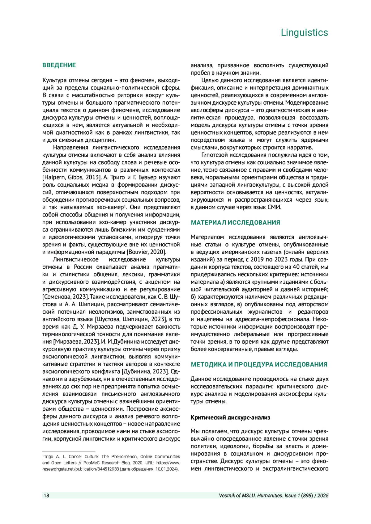 Культура отмены сегодня – это феномен, выходящий за пределы социально-политической сферы. В связи с масштабностью риторики вокруг культуры отмены и большого прагматического потенциала текстов о данном феномене, исследование дискурса культуры отмены и ценностей, воплощающихся в нем, является актуальной и необходимой диагностикой как в рамках лингвистики, так и для смежных дисциплин.
