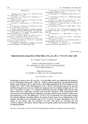 Cosideration is given to the a-Si1-xGex: H (x = 01) thin films which were obtained by the method aSi1-xGex: H using gas mixtures H2 + SiH4; H2 + GeH4 in various proportions. It is determined that the highest value of R (up to 0.8) is observed for a-Si: H films deposited by the PCO method at a temperature of T = 300 oС with a discharge power of W = 100 W. From the given data on the ratio, the oscillator strength in the a-Si1-xGex: H film was estimated, wher the oscillator strengths are Q = 0.51 (for x = 0) and Q = 0.13 (for x = 1). Using the a-Si: H and a-Si0.88Ge0.12: H films, solar cells were fabricated which have single-layer, two-layer and three-layer structures. Their characteristics have been measured. It was found that for single-layer, two-layer and three-layer structures (with an area of an element of 1.3 cm2), the efficiency is 7 %; 8.9 %; 9.5 % respectively. For a three-layer element, the collection efficiency maximum shifts to the region of longer waves. It was obtained that, at illumination with light in the wavelength range of 0.3–1.1 μm for 120 hours, degradation wasn’t observed. It was shown that the structures of solar cells based on a-Si0.88Ge0.12: H and a-Si: H are effective. The further works to improve the quality of films and increase their efficiency are topical problems.
