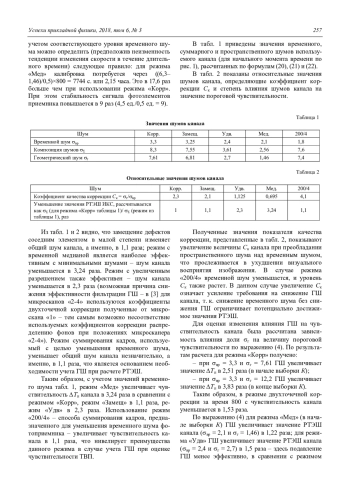 Преимущества накопления кадров фотоприемника (для снижения временного шума в итоговом изображении) сомнительны: в случае учета ГШ при расчете чувствительности ТВП улучшение составляет 1,1 раза. Целесообразность использования накопления кадров просматривается только в случае достаточного снижения уровня пространственного шума – до значений г/вр < 1, т. е. когда временная компонента общего шума канала будет преобладать над пространственной компонентой.