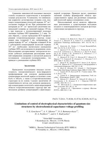 Гончаров В. Е., Никонов А. В., Батмановская Н. С., Пашкеев Д. А., Кудряшов А. В. Физические пределы контроля электрофизических характеристик квантоворазмерных структур средствами электрохимического вольт-фарадного профилирования 290