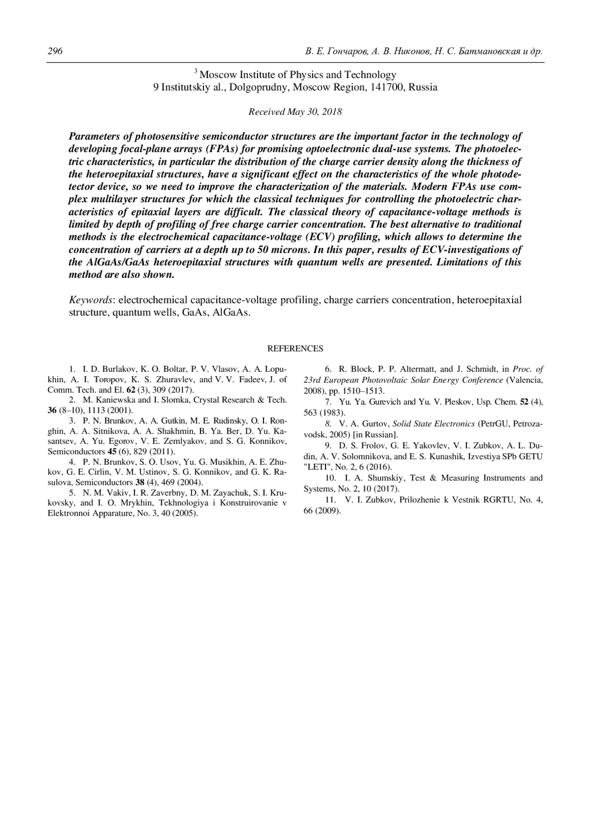V. E. Goncharov, A. V. Nikonov, N. S. Batmanovskaya, D. A. Pashkeev, and A. V. Kudryashov Limitations of control of electrophysical characteristics of quantum-size structures by electrochemical capacitance-voltage profiling 290