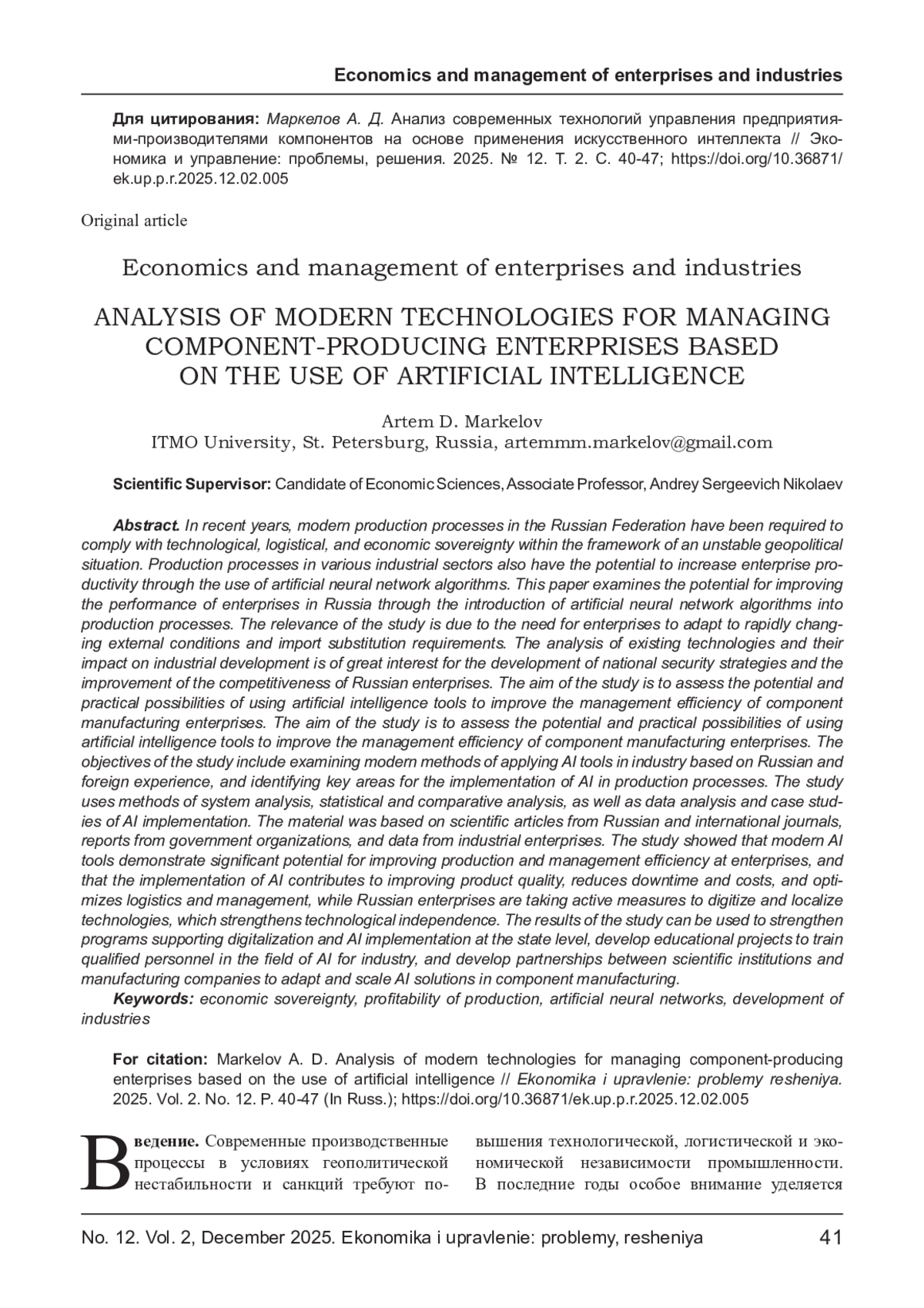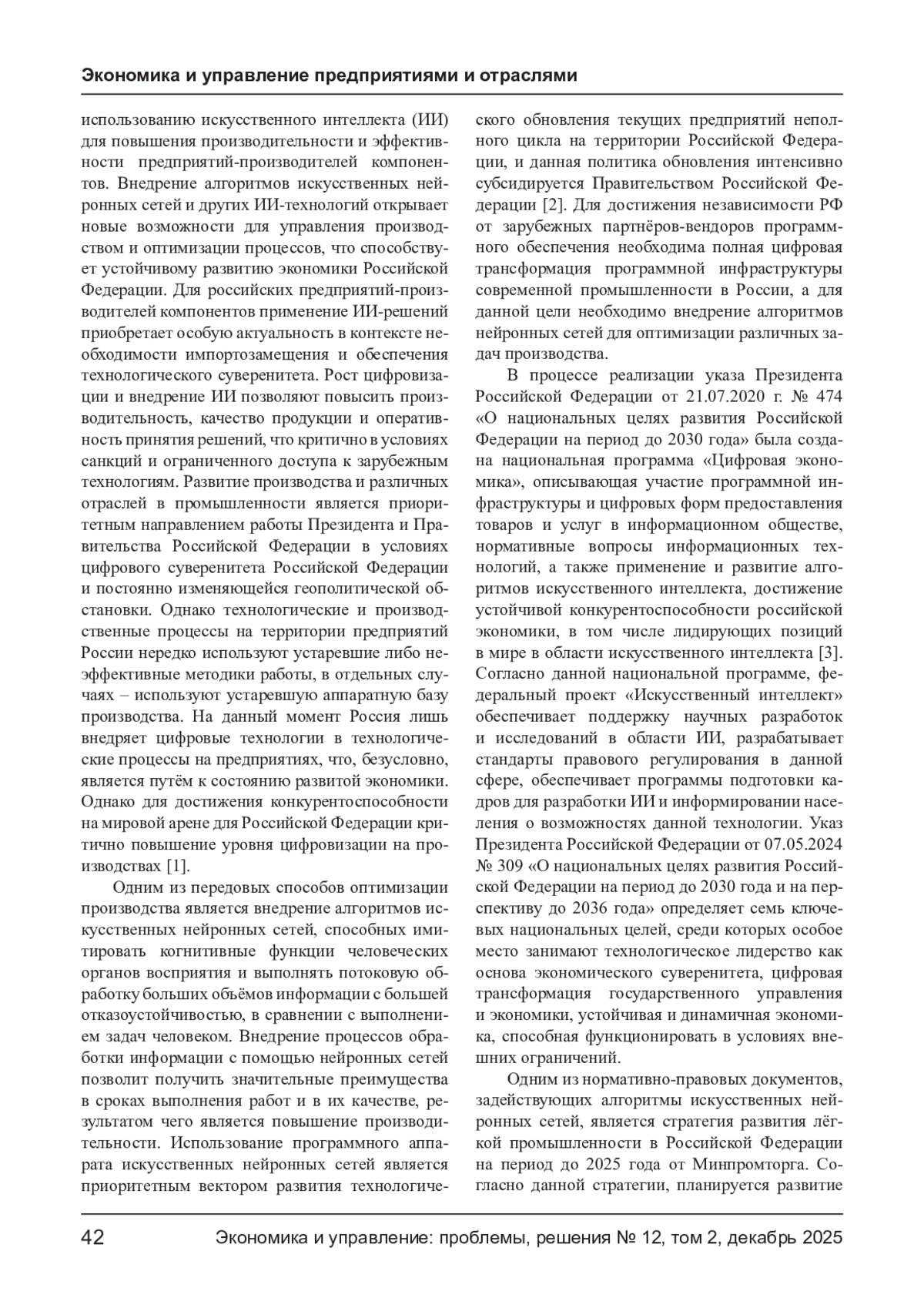 Современные процессы производства в Российской Федерации в последние несколько лет получили необходимость соблюдения технологического, логистического и экономического суверенитета в рамках нестабильной геополитической обстановки. Также процессы производства в различных сферах промышленности имеют возможности по повышению производительности предприятий с помощью применения алгоритмов искусственных нейронных сетей. Данная работа рассматривает потенциал улучшения показателей производительности предприятий на территории России посредством внедрения алгоритмов искусственных нейронных сетей в процессы производства. Актуальность исследования обусловлена необходимостью адаптации предприятий к быстро меняющимся внешним условиям и требованиям импортозамещения. Анализ существующих технологий и их влияние на развитие промышленности представляют большой интерес для разработки стратегий национальной безопасности и повышения конкурентоспособности российских предприятий. Целью исследования является оценка потенциала и практических возможностей использования инструментов искусственного интеллекта для повышения эффективности управления предприятиями-производителями компонентов.
