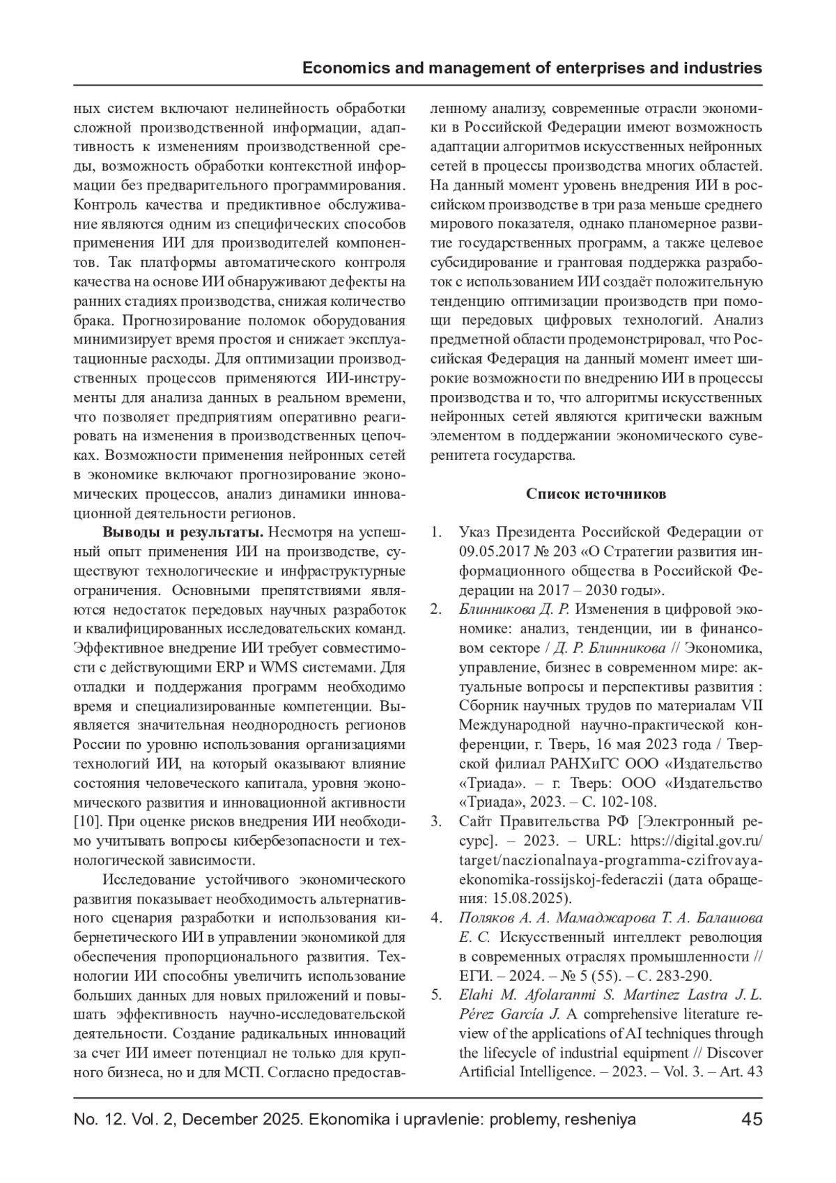 9. Пономарев Д. С. Нейросетевые методы прогнозирования в производственном секторе: MLP или RNN? // Информатика. Экономика. Управление. - 2025. - Т. 4, № 2. - С. 3001-3006.