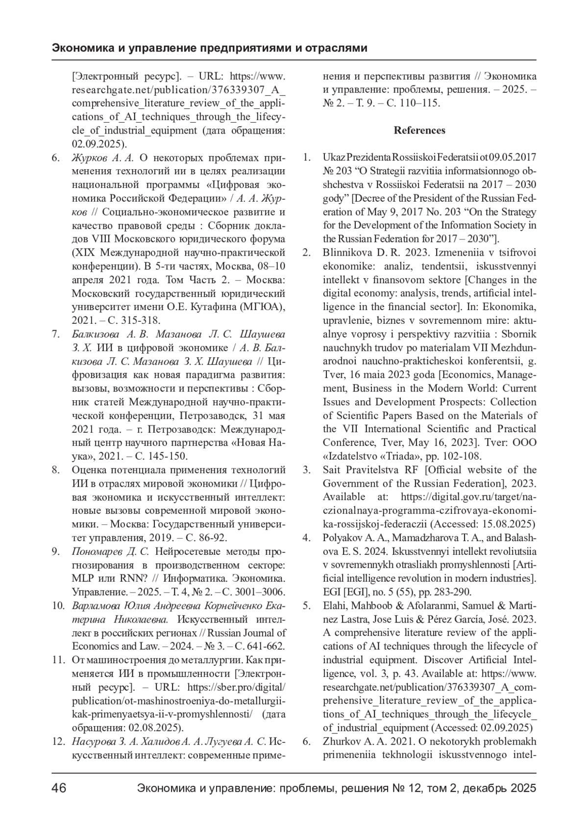 12. Насурова З. А. Халидов А. А. Лугуева А. С. Искусственный интеллект: современные приме нения и перспективы развития // Экономика и управление: проблемы, решения. - 2025. - № 2. - Т. 9. - С. 110-115.