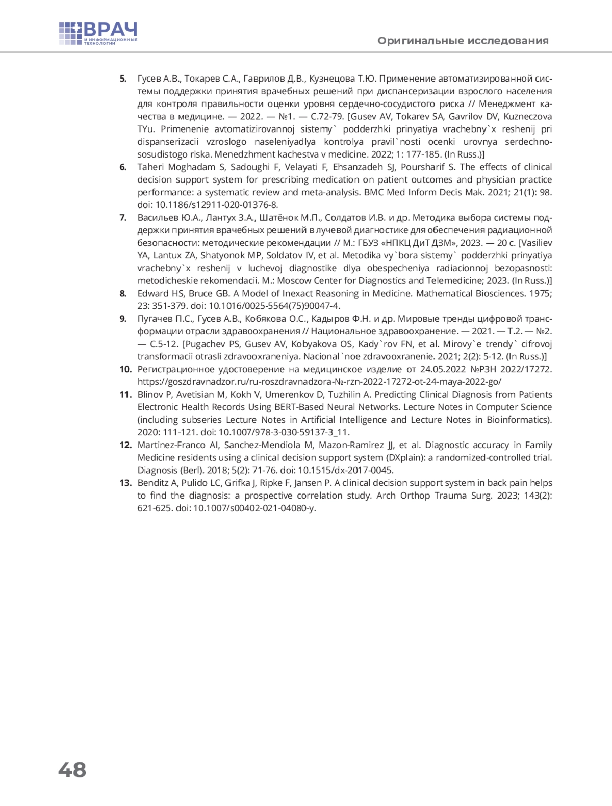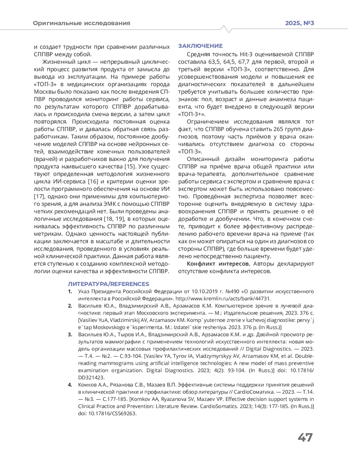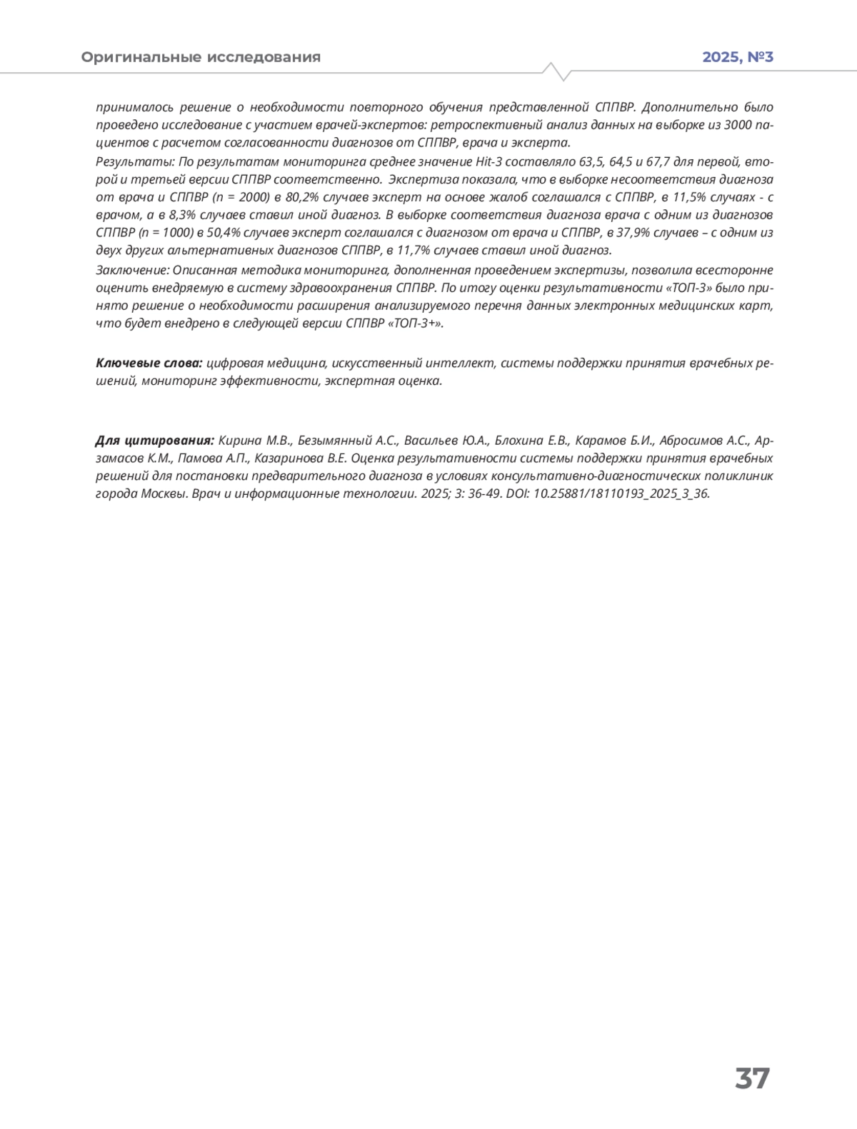 ВАСИЛЬЕВ Ю. А., КИРИНА М.В., БЕЗЫМЯННЫЙ А.С., БЛОХИНА Е.В., КАРАМОВ Б.И., АБРОСИМОВ А.С., АРЗАМАСОВ К. М., ПАМОВА А. П., КАЗАРИНОВА В. Е. ОЦЕНКА РЕЗУЛЬТАТИВНОСТИ СИСТЕМЫ ПОДДЕРЖКИ ПРИНЯТИЯ ВРАЧЕБНЫХ РЕШЕНИЙ ДЛЯ ПОСТАНОВКИ ПРЕДВАРИТЕЛЬНОГО ДИАГНОЗА В УСЛОВИЯХ КОНСУЛЬТАТИВНО-ДИАГНОСТИЧЕСКИХ ПОЛИКЛИНИК ГОРОДА МОСКВЫ // ВРАЧ И ИНФОРМАЦИОННЫЕ ТЕХНОЛОГИИ. 2025. № 3