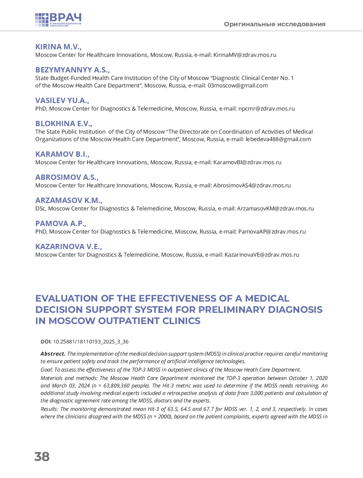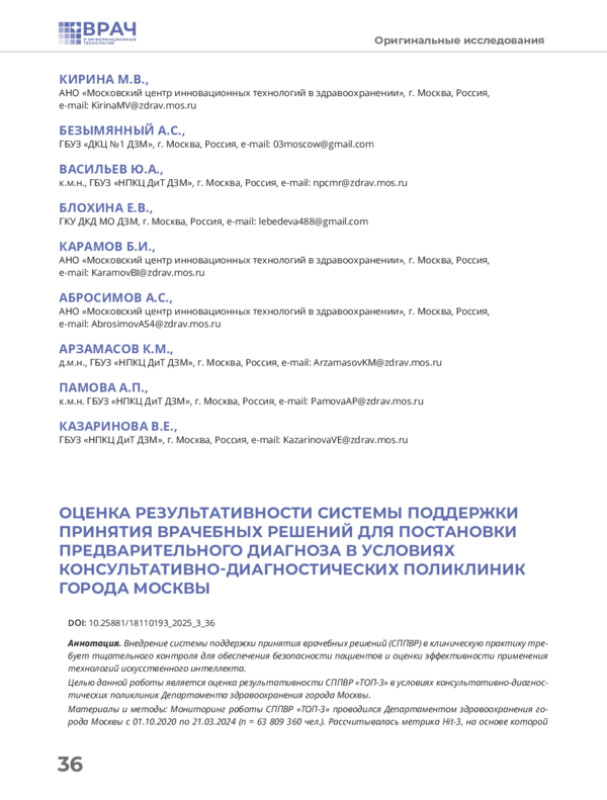 Статья: ОЦЕНКА РЕЗУЛЬТАТИВНОСТИ СИСТЕМЫ ПОДДЕРЖКИ ПРИНЯТИЯ ВРАЧЕБНЫХ РЕШЕНИЙ ДЛЯ ПОСТАНОВКИ ПРЕДВАРИТЕЛЬНОГО ДИАГНОЗА В УСЛОВИЯХ КОНСУЛЬТАТИВНО-ДИАГНОСТИЧЕСКИХ ПОЛИКЛИНИК ГОРОДА МОСКВЫ (2025)