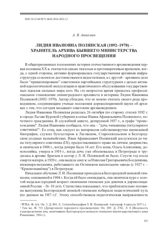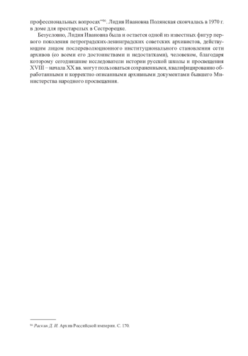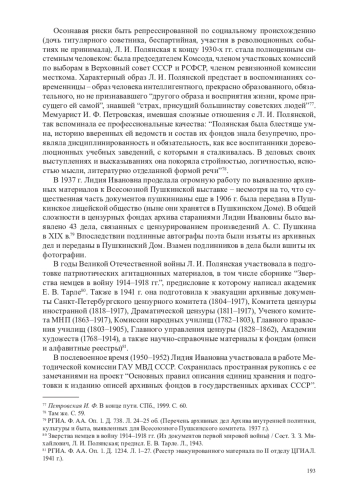 В общепризнанных положениях истории отечественного архивоведения первая половина XX в. считается самым тяжелым и противоречивым временем, когда, с одной стороны, активно формировалась государственная архивная инфраструктура со всеми ее достоинствами и недостатками, а с другой – архивное дело было “приватизировано” советскими партийными структурами с целью активной идеологической эксплуатации и практического обслуживания государственных идеалов сильных мира сего. На это непростое время пришлось профессиональное становление ленинградского архивиста и историка Лидии Ивановны Полянской (1892–1970). Автор убежден, что ее можно считать своего рода проводником, соединяющим ученые положения дореволюционной науки об архивах с тем, что сегодня называют советским архивоведением.