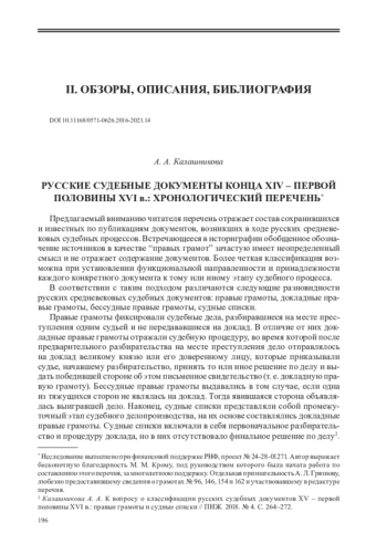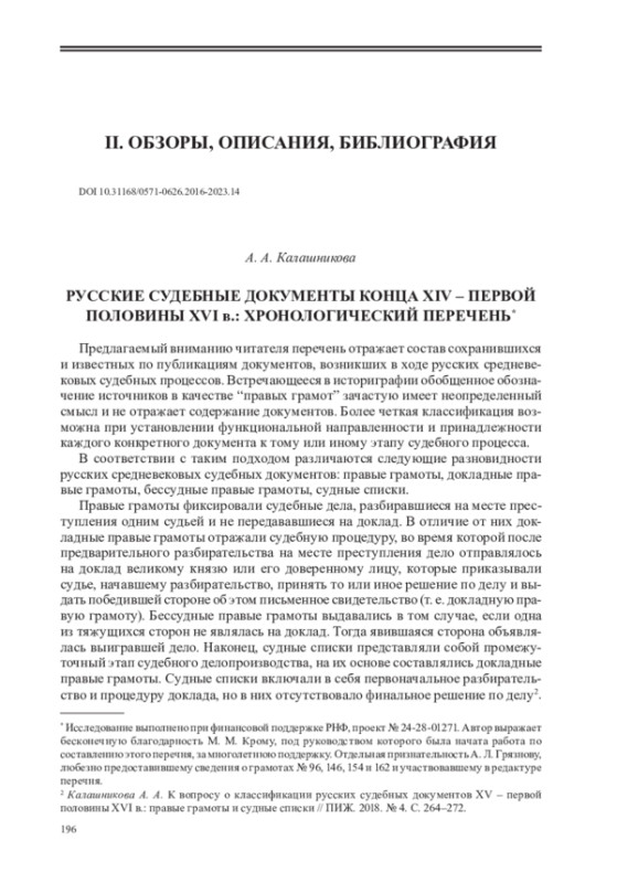 1. Калашникова А. А. К вопросу о классификации русских судебных документов XV - первой половины XVI в.: правые грамоты и судные списки // Петербургский исторический журнал: Исследования по российской и всеобщей истории. 2018. № 4. С. 264-272.