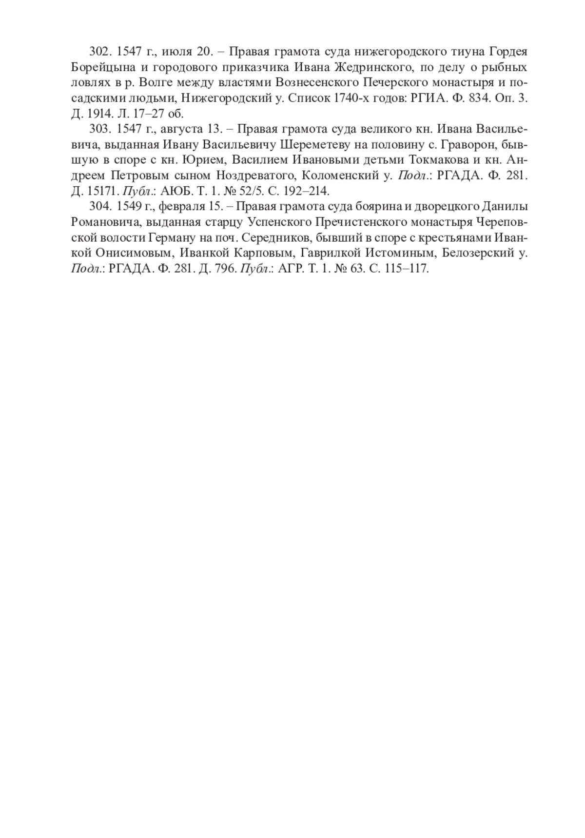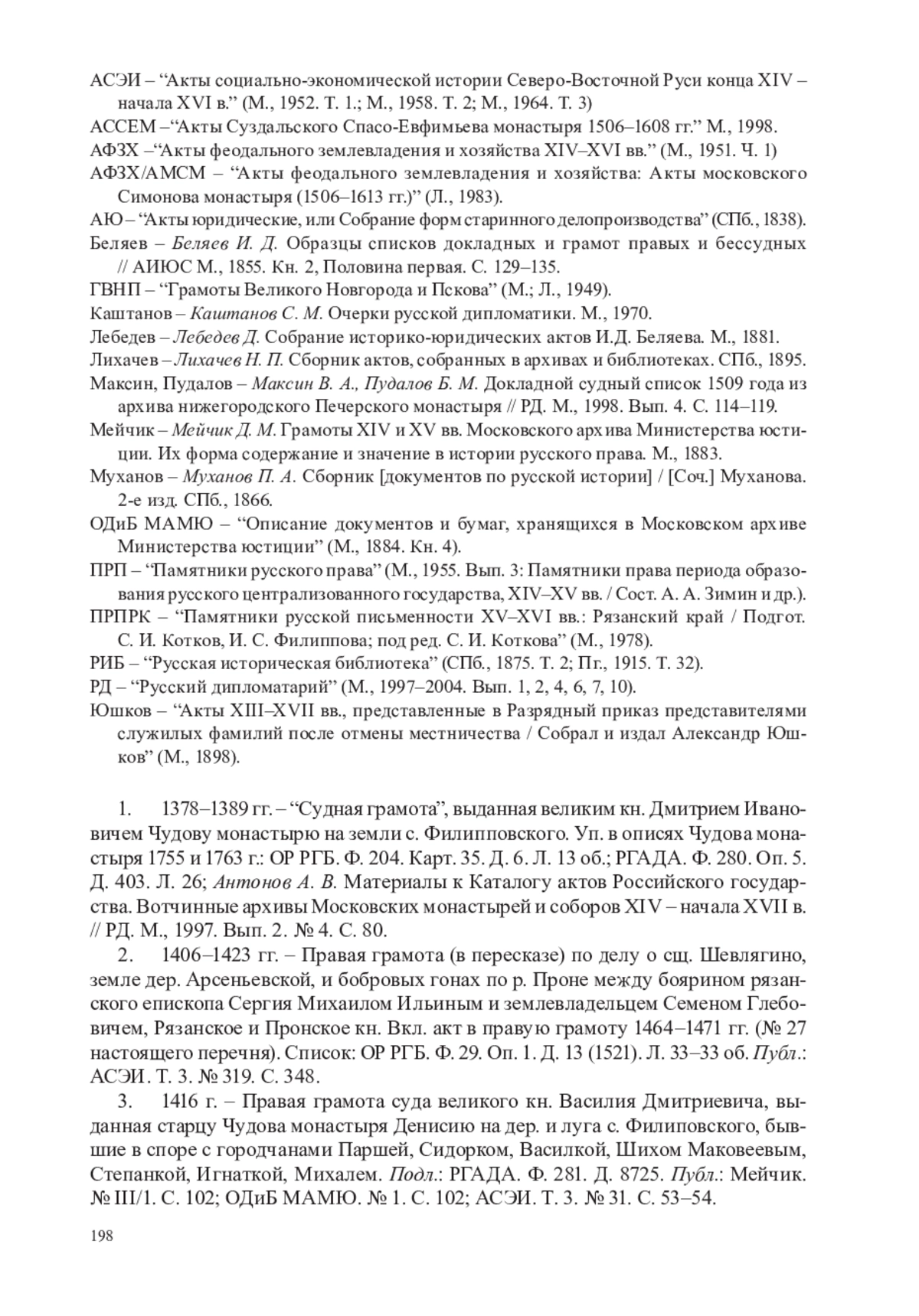 Предлагаемый вниманию читателя перечень отражает состав сохранившихся и известных по публикациям документов, возникших в ходе русских средневековых судебных процессов. Встречающееся в историграфии обобщенное обозначение источников в качестве “правых грамот” зачастую имеет неопределенный смысл и не отражает содержание документов. Более четкая классификация возможна при установлении функциональной направленности и принадлежности каждого конкретного документа к тому или иному этапу судебного процесса.