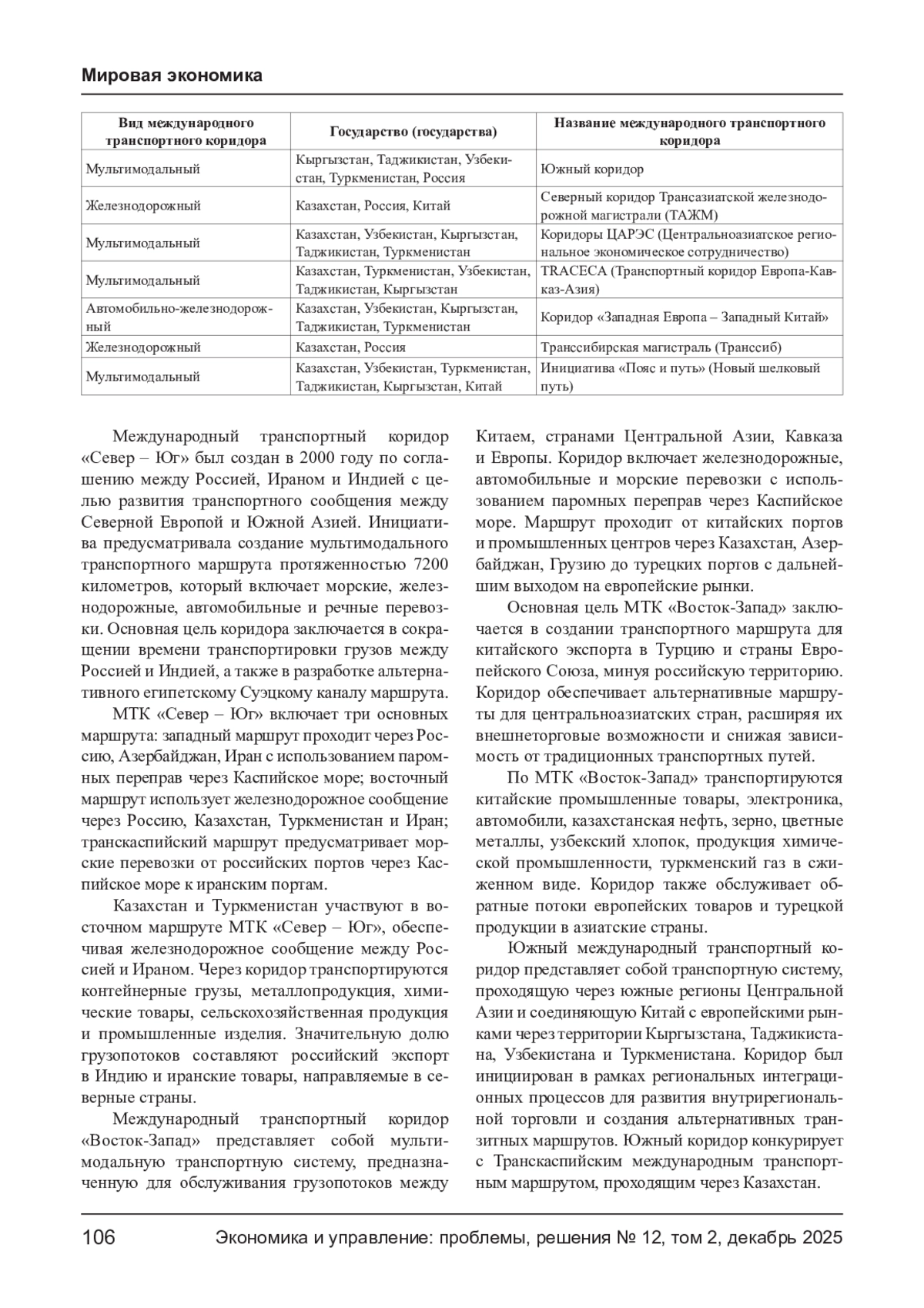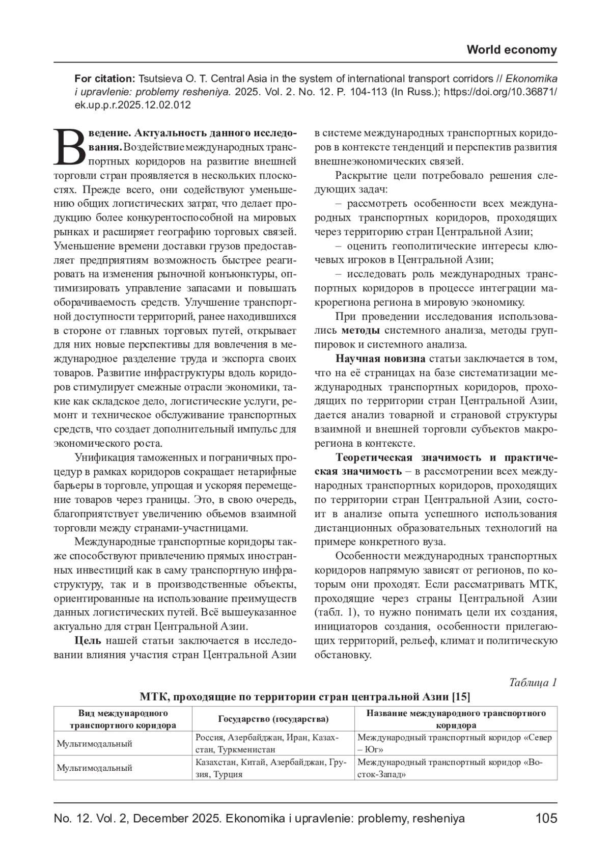 Особенности международных транспортных коридоров напрямую зависят от регионов, по которым они проходят. В данной статье рассмотрены международные транспортные коридоры, проходящие через страны Центральной Азии, а именно цели их создания, инициаторов создания, особенности прилегающих территорий. Стоит отметить, что каждый коридор рассматривается в ракурсе товарной структуры перевозимых грузов, а также для обслуживания грузопотоков между какими странами предназначен исследуемый коридор. Автором делается акцент на особенности стран Центральной Азии (рельеф, климат), которые в значительной степени определяют, во-первых, приоритетный вид транспорта, во-вторых, активность развития международной логистики в регионе. Показано, что 1/3 перевозок Китай-Европа проходит по территории стран Центральной Азии.