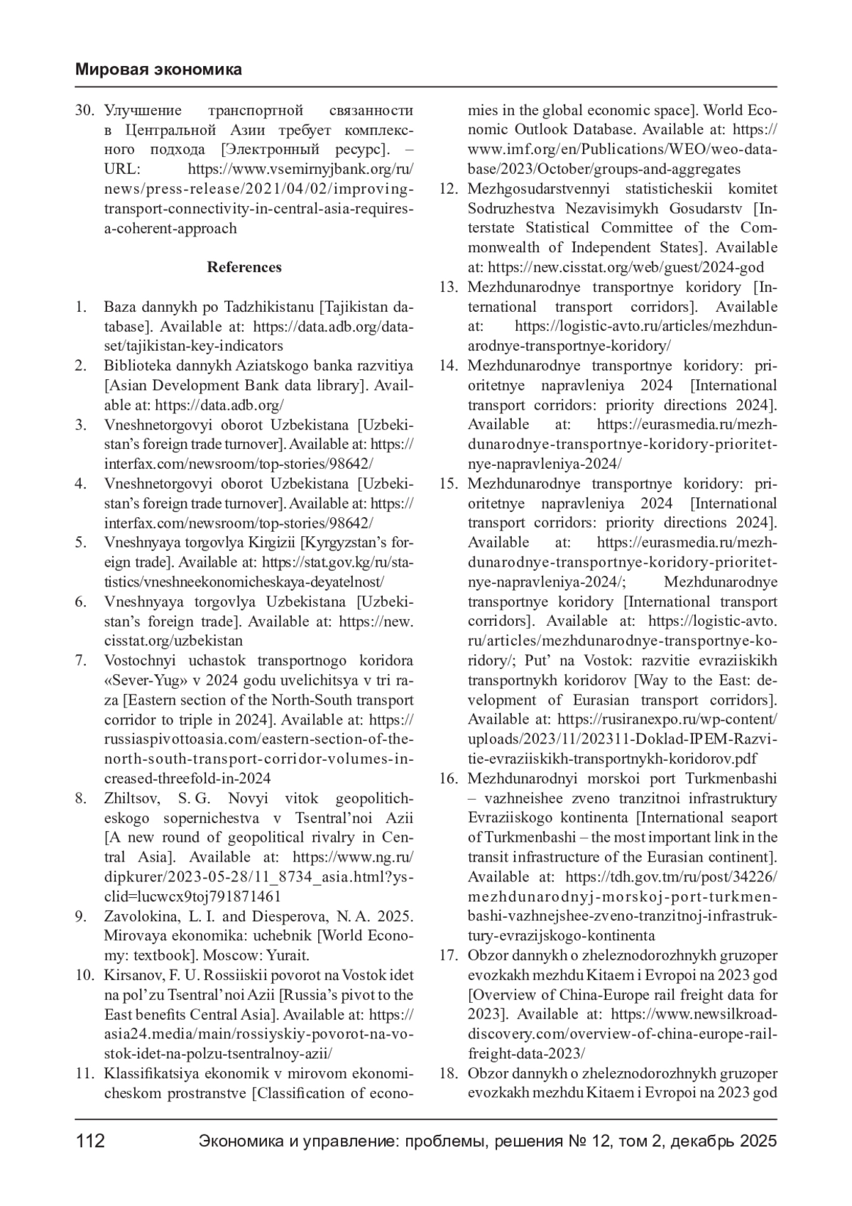 30. Улучшение транспортной связанности в Центральной Азии требует комплексного подхода [Электронный ресурс]. - URL: https://www.vsemirnyjbank.org/ru/news/press-release/2021/04/02/improvingtransport-connectivity-in-central-asia-requiresa-coherent-approach.