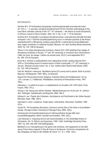 28. Dmitriev M.V. Ot hristianskoj antropologii vostochnoslavyanskih pravoslavnyh kultur XV-XVI vv. - k “provalu” socialnoj disciplinarizacii? [From Christian anthropology of the East Slavic orthodox cultures of the 15th-16th centuries - the failure of social discipline?], in Chinese Journal of Slavic Studies. 2022. Vol. 2. No. 2. Pp. 1-19 (in Russian).