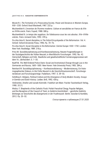 7. Behrisch L. Sozialdisziplinierung // Enzyklopädie der Neuzeit. Vol. 12. Stuttgart: J.B. Metzler, 2010. Col. 220-229.