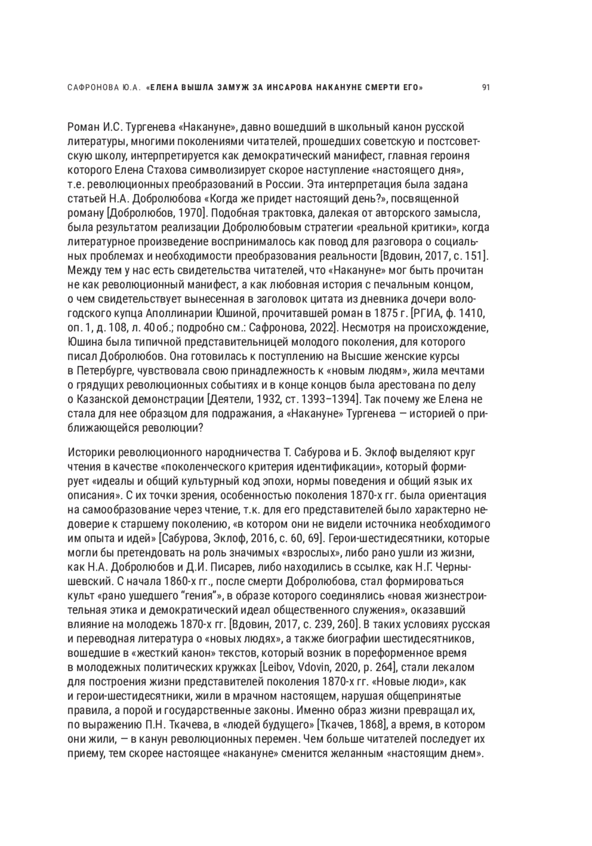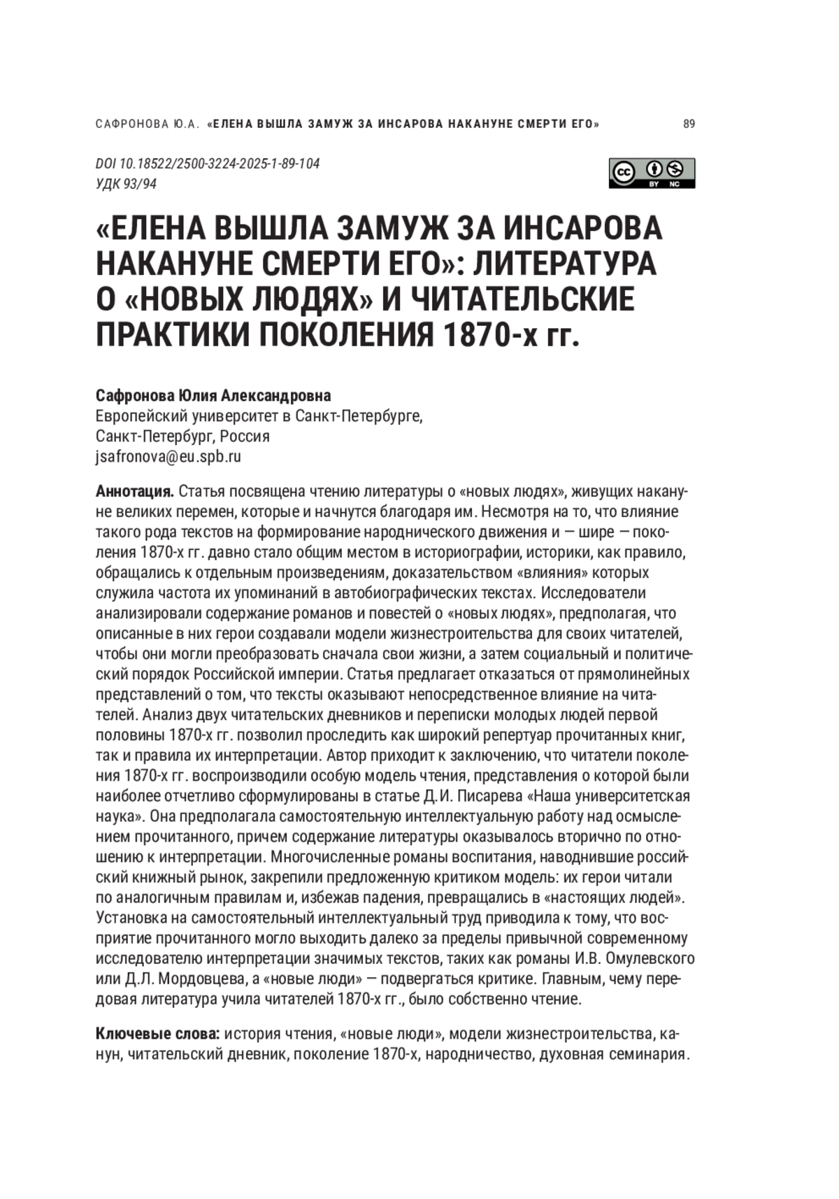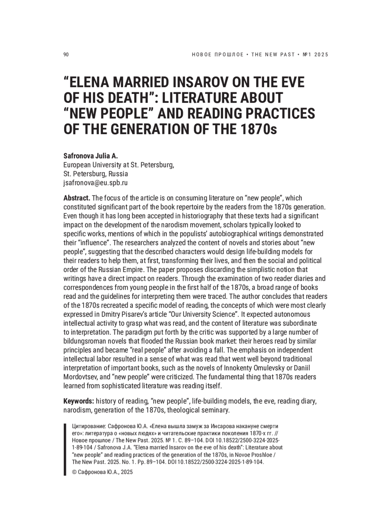 САФРОНОВА Ю. А. «ЕЛЕНА ВЫШЛА ЗАМУЖ ЗА ИНСАРОВА НАКАНУНЕ СМЕРТИ ЕГО»: ЛИТЕРАТУРА О «НОВЫХ ЛЮДЯХ» И ЧИТАТЕЛЬСКИЕ ПРАКТИКИ ПОКОЛЕНИЯ 1870-Х ГГ // НОВОЕ ПРОШЛОЕ. 2025. № 1