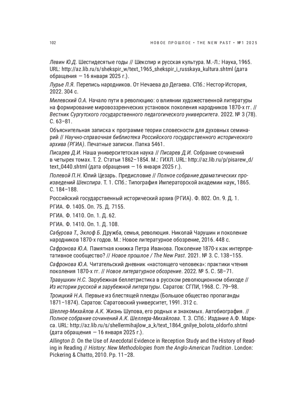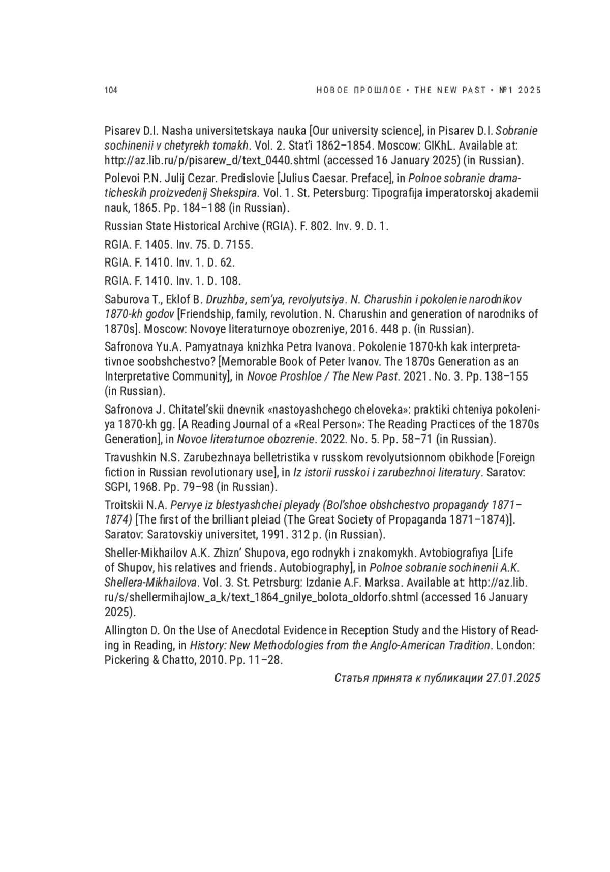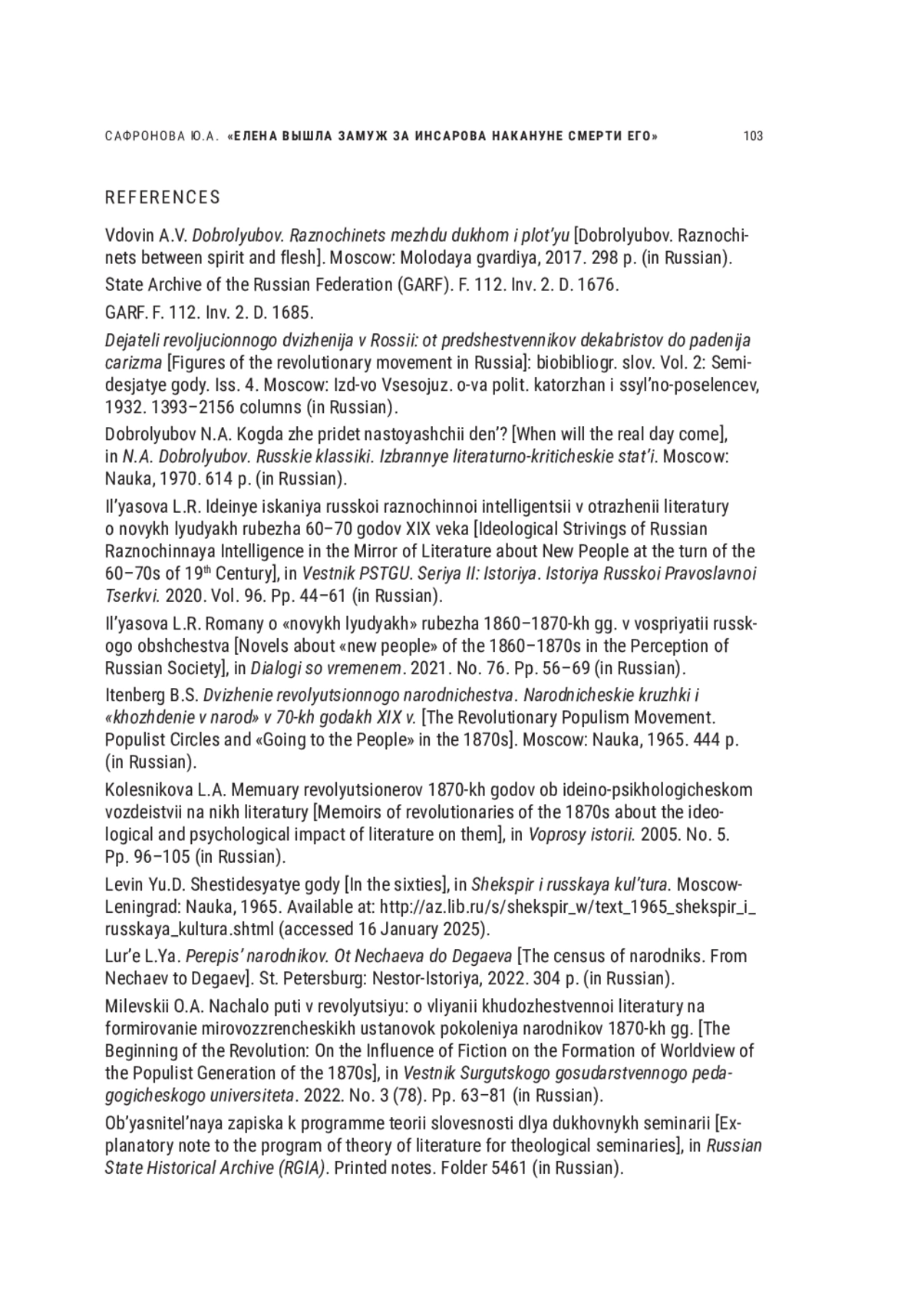 САФРОНОВА Ю. А. «ЕЛЕНА ВЫШЛА ЗАМУЖ ЗА ИНСАРОВА НАКАНУНЕ СМЕРТИ ЕГО»: ЛИТЕРАТУРА О «НОВЫХ ЛЮДЯХ» И ЧИТАТЕЛЬСКИЕ ПРАКТИКИ ПОКОЛЕНИЯ 1870-Х ГГ // НОВОЕ ПРОШЛОЕ. 2025. № 1