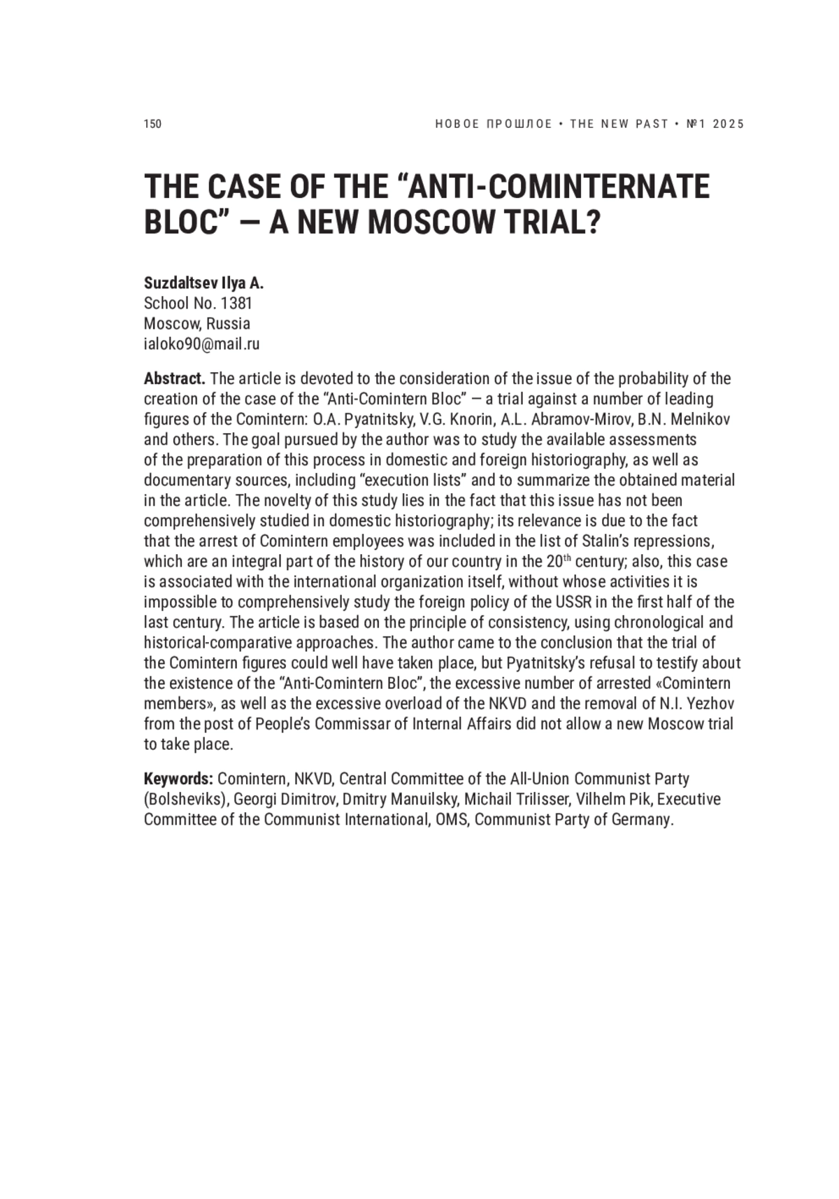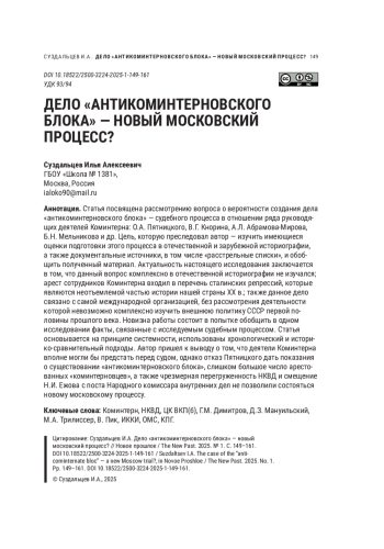 Статья посвящена рассмотрению вопроса о вероятности создания дела «антикоминтерновского блока» — судебного процесса в отношении ряда руководящих деятелей Коминтерна: О. А. Пятницкого, В. Г. Кнорина, А. Л. Абрамова-Мирова, Б. Н. Мельникова и др. Цель, которую преследовал автор — изучить имеющиеся оценки подготовки этого процесса в отечественной и зарубежной историографии, а также документальные источники, в том числе «расстрельные списки», и обобщить полученный материал. Актуальность настоящего исследования заключается в том, что данный вопрос комплексно в отечественной историографии не изучался; арест сотрудников Коминтерна входил в перечень сталинских репрессий, которые являются неотъемлемой частью истории нашей страны XX в.; также данное дело связано с самой международной организацией, без рассмотрения деятельности которой невозможно комплексно изучить внешнюю политику СССР первой половины прошлого века. Новизна работы состоит в попытке обобщить в одном исследовании факты, связанные с исследуемым судебным процессом. Статья основывается на принципе системности, использованы хронологический и историко-сравнительный подходы. Автор пришел к выводу о том, что деятели Коминтерна вполне могли бы предстать перед судом, однако отказ Пятницкого дать показания о существовании «антикоминтерновского блока», слишком большое число арестованных «коминтерновцев», а также чрезмерная перегруженность НКВД и смещение Н. И. Ежова с поста Народного комиссара внутренних дел не позволили состояться новому московскому процессу
