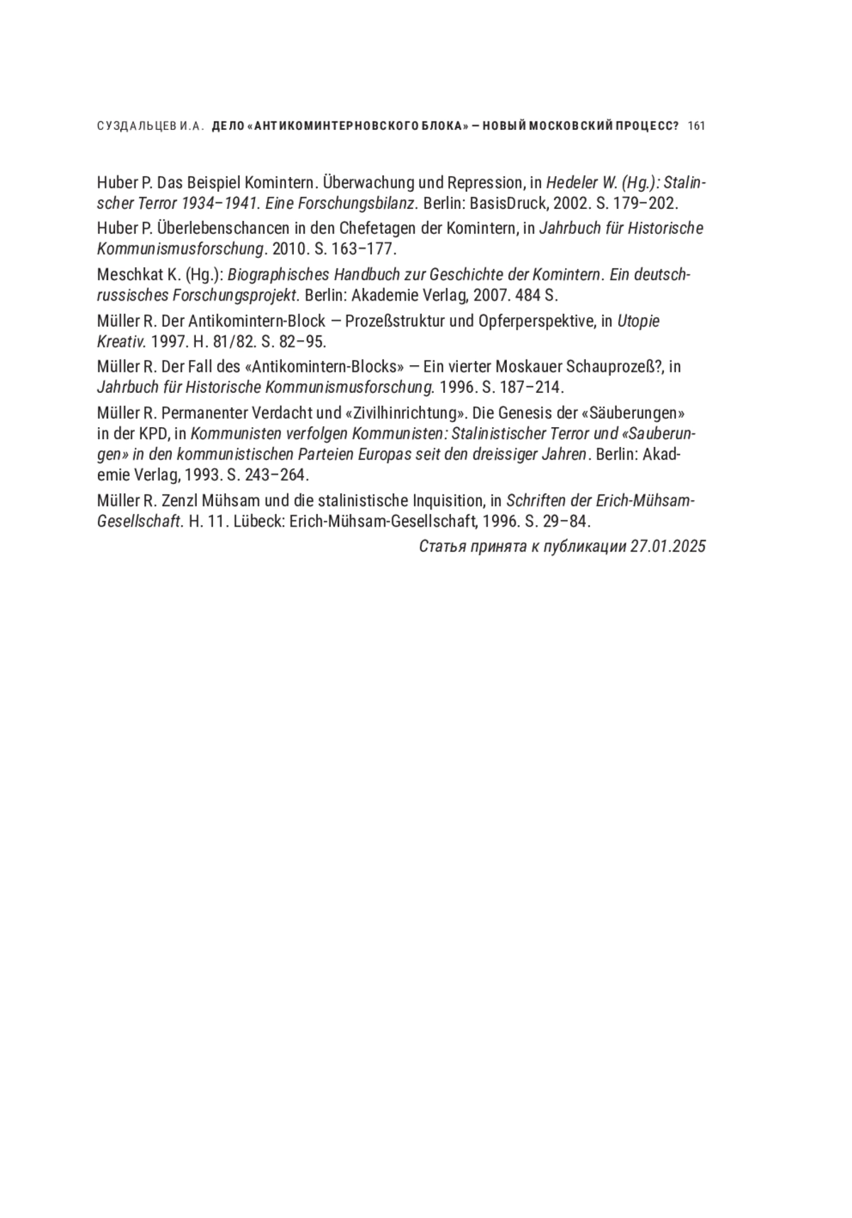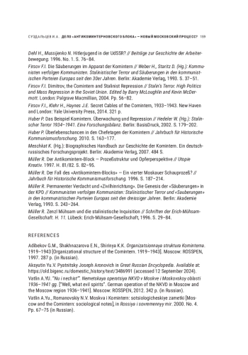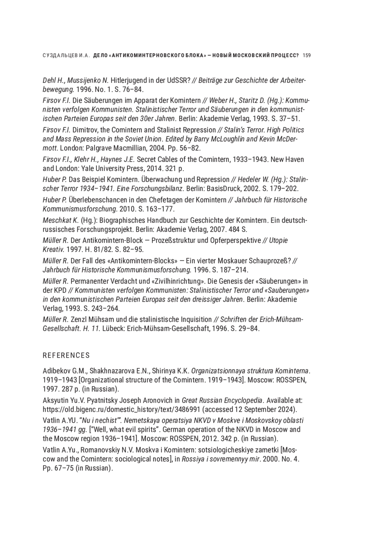 21. Huber P. Das Beispiel Komintern. Überwachung und Repression // Hedeler W. (Hg.): Stalinscher Terror 1934-1941. Eine Forschungsbilanz. Berlin: BasisDruck, 2002. S. 179-202.