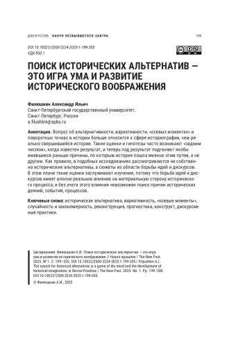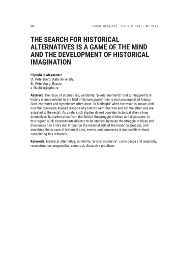 Проблема гипотетических рассуждений об альтернативности прошлого и необходимости изучения образов будущего в прошлом рассматривается сквозь призму теории современных социогуманитарных наук. Отмечается важность факторов непредвиденного в жизни людей и законность профессионального интереса историка как к мотивам исторических акторов, так и к альтернативным реконструкциям прошлого, вызывающим дискуссии о закономерности тех или иных явлений прошлого. Отмечается роль Р. Козеллека, привнесшего в историографию феноменологическую трактовку исторического времени как смены «теперь» — цепи событий, связанных «пространством опыта» и «горизонтами ожидания» живущих поколений, подчеркивается также значимость его представлений о рекурсивной связи «слоев времени», вбирающих в себя и жизнь человека, и бытование длительно существующих социальных структур. Тема проживания исторических канунов современниками представлена в логике рассуждения о темпоральных дискурсах. Историк имеет свободу выбора: уделять ему внимание «подводным течениям» коллективного бессознательного или посвятить себя постфактуальному моделированию, руководствуясь непреложным знанием исходов. Историю победителей и побежденных следует, по мнению автора, писать с позиций симметричного их представления, с обозначением всех значимых контекстуальных нюансов их существования, а историю утопических дискурсов — с позиций того, что разделяемые массой людей убеждения сами становятся влиятельным фактором формирования будущего, даже если грядущее сформируется отличным от ожидаемого образом