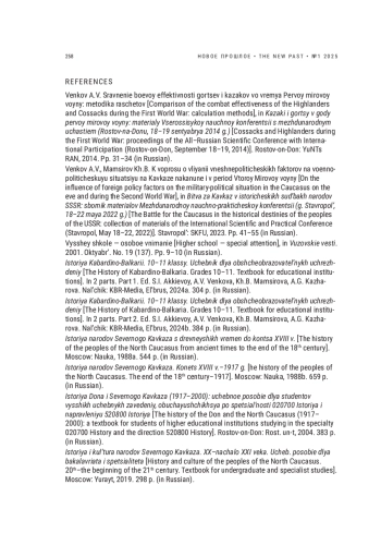 28. Istoriya i kul’tura narodov Severnogo Kavkaza. XX-nachalo XXI veka. Ucheb. posobie dlya bakalavriata i spetsialiteta [History and culture of the peoples of the North Caucasus. 20th-the beginning of the 21th century. Textbook for undergraduate and specialist studies]. Moscow: Yurayt, 2019. 298 p. (in Russian).