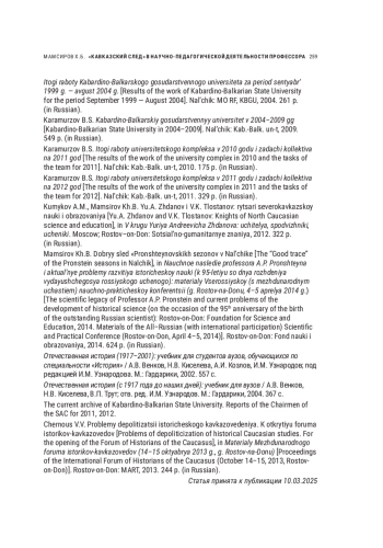 34. Mamsirov Kh.B. Dobryy sled “Pronshteynovskikh sezonov v Nal’chike [The “Good trace” of the Pronstein seasons in Nalchik], in Nauchnoe nasledie professora A.P. Pronshteyna i aktual’nye problemy razvitiya istoricheskoy nauki (k 95-letiyu so dnya rozhdeniya vydayushchegosya rossiyskogo uchenogo): materialy Vserossiyskoy (s mezhdunarodnym uchastiem) nauchno-prakticheskoy konferentsii (g. Rostov-na-Donu, 4-5 aprelya 2014 g.)[The scientific legacy of Professor A.P. Pronstein and current problems of the development of historical science (on the occasion of the 95th anniversary of the birth of the outstanding Russian scientist): Rostov-on-Don: Foundation for Science and Education, 2014. Materials of the All-Russian (with international participation) Scientific and Practical Conference (Rostov-on-Don, April 4-5, 2014)]. Rostov-on-Don: Fond nauki i obrazovaniya, 2014. 624 p. (in Russian).