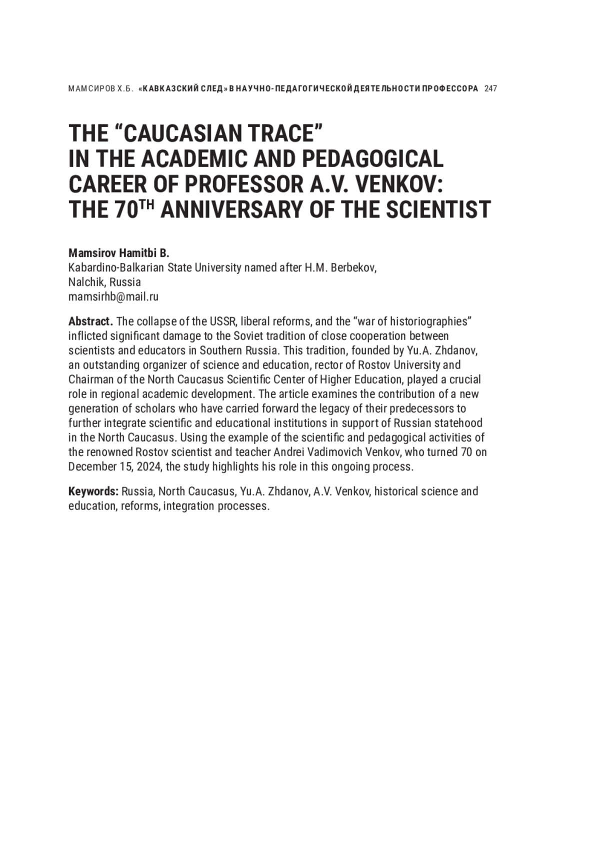 Распад СССР, либеральные реформы, «война историографий» нанесли большей урон советской традиции плодотворного взаимодействия ученых и педагогов Юга России, заложенной Ю. А. Ждановым — выдающимся организатором науки и образования, ректором Ростовского университета и Председателем Северо-Кавказского научного центра высшей школы. В статье рассказывается о научно-педагогической деятельности известного ростовского ученого и педагога Андрея Вадимовича Венкова, которому 15 декабря 2024 г. исполнилось 70 лет, рассматривается вклад новой генерации ученых, подхвативших эстафетную палочку старших товарищей по дальнейшему углублению интеграции деятельности научных и образовательных учреждений в интересах сохранения и укрепления российской государственности на Северном Кавказе.