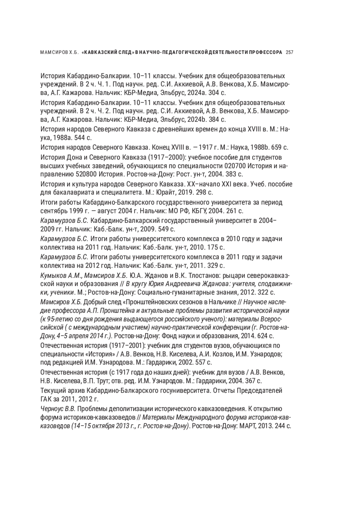 24. Istoriya Kabardino-Balkarii. 10-11 klassy. Uchebnik dlya obshcheobrazovatel’nykh uchrezhdeniy [The History of Kabardino-Balkaria. Grades 10-11. Textbook for educational institutions]. In 2 parts. Part 2. Ed. S.I. Akkievoy, A.V. Venkova, Kh.B. Mamsirova, A.G. Kazharova. Nal’chik: KBR-Media, El’brus, 2024b. 384 p. (in Russian).