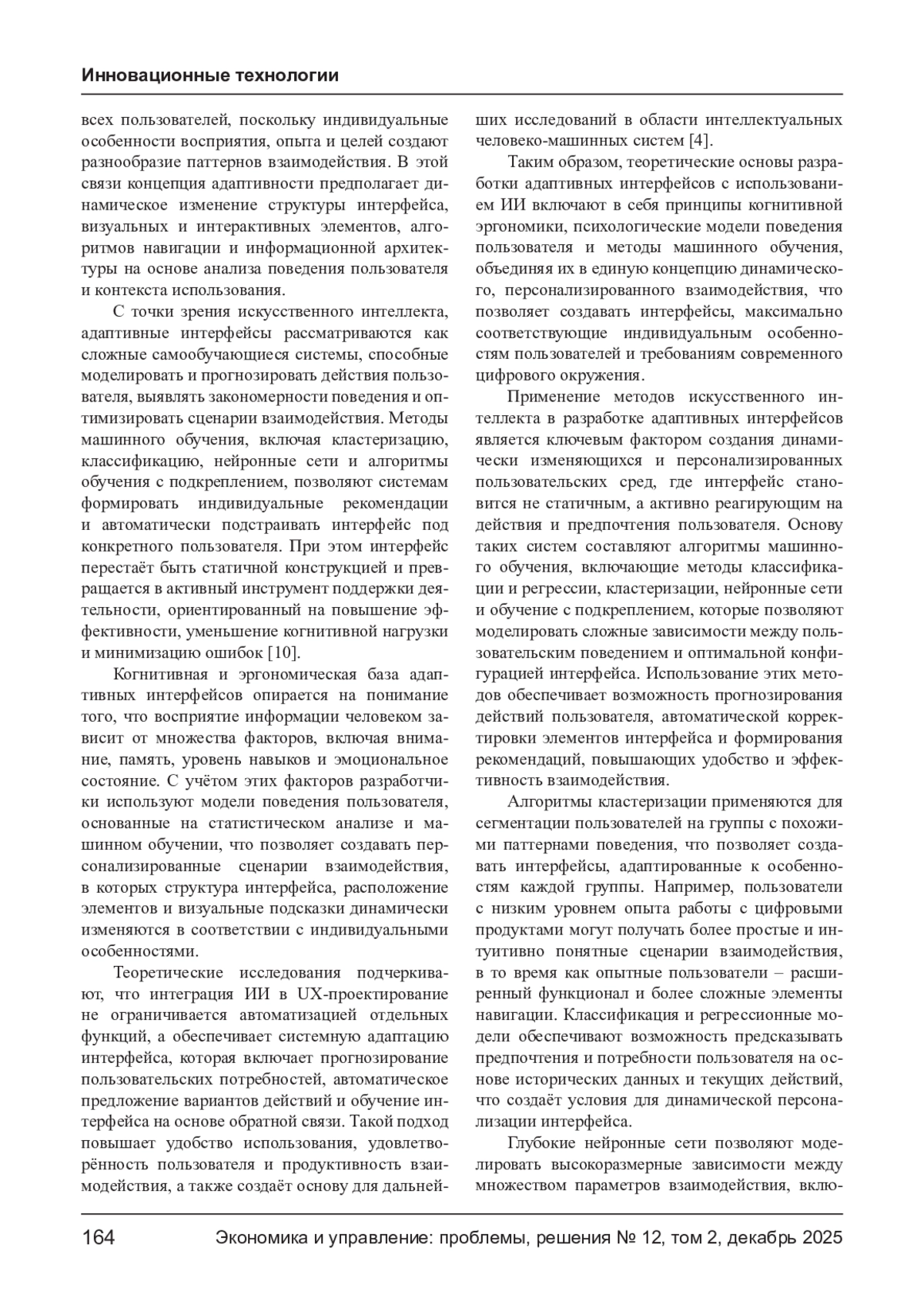 Современные цифровые системы предъявляют высокие требования к удобству и персонализации пользовательских интерфейсов, что делает использование методов искусственного интеллекта особенно актуальным. Адаптивные интерфейсы, способные самостоятельно подстраиваться под индивидуальные особенности пользователя, уровень его опыта и контекст взаимодействия, становятся ключевым элементом повышения эффективности и качества цифровых продуктов. В статье рассматриваются теоретические и практические аспекты разработки таких интерфейсов с использованием ИИ. Особое внимание уделено методам машинного обучения, нейросетевым моделям, алгоритмам прогнозирования поведения пользователей и интеграции этих методов в архитектуру интерфейсов.