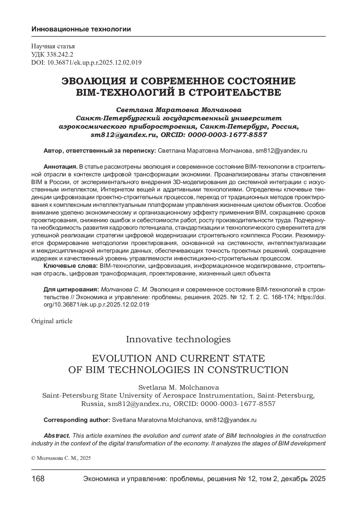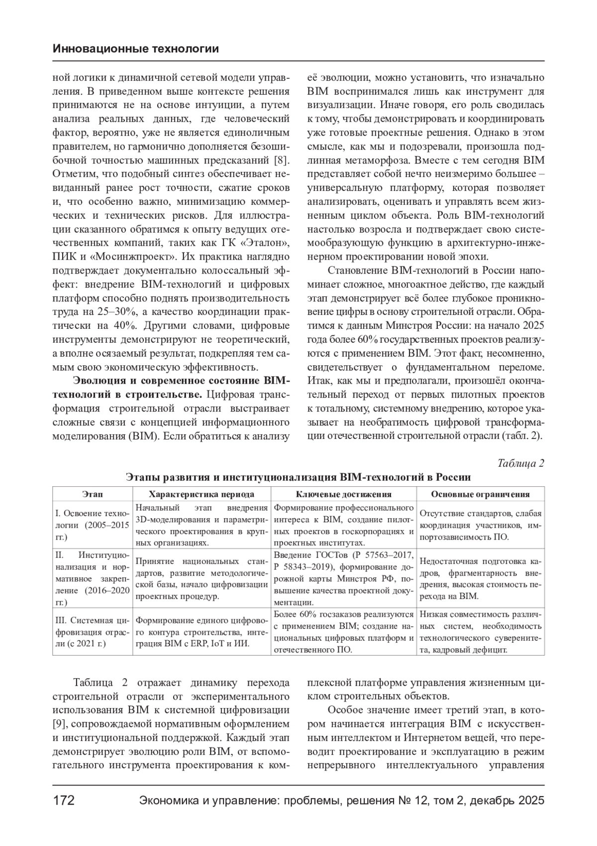 В статье рассмотрены эволюция и современное состояние BIM-технологии в строительной отрасли в контексте цифровой трансформации экономики. Проанализированы этапы становления BIM в России, от экспериментального внедрения 3D-моделирования до системной интеграции с искусственным интеллектом, Интернетом вещей и аддитивными технологиями. Определены ключевые тенденции цифровизации проектно-строительных процессов, переход от традиционных методов проектирования к комплексным интеллектуальным платформам управления жизненным циклом объектов. Особое внимание уделено экономическому и организационному эффекту применения BIM, сокращению сроков проектирования, снижению ошибок и себестоимости работ, росту производительности труда. Подчеркнута необходимость развития кадрового потенциала, стандартизации и технологического суверенитета для успешной реализации стратегии цифровой модернизации строительного комплекса России. Резюмируется формирование методологии проектирования, основанной на системности, интеллектуализации и междисциплинарной интеграции данных, обеспечивающих точность проектных решений, сокращение издержек и качественный уровень управляемости инвестиционно-строительным процессом.