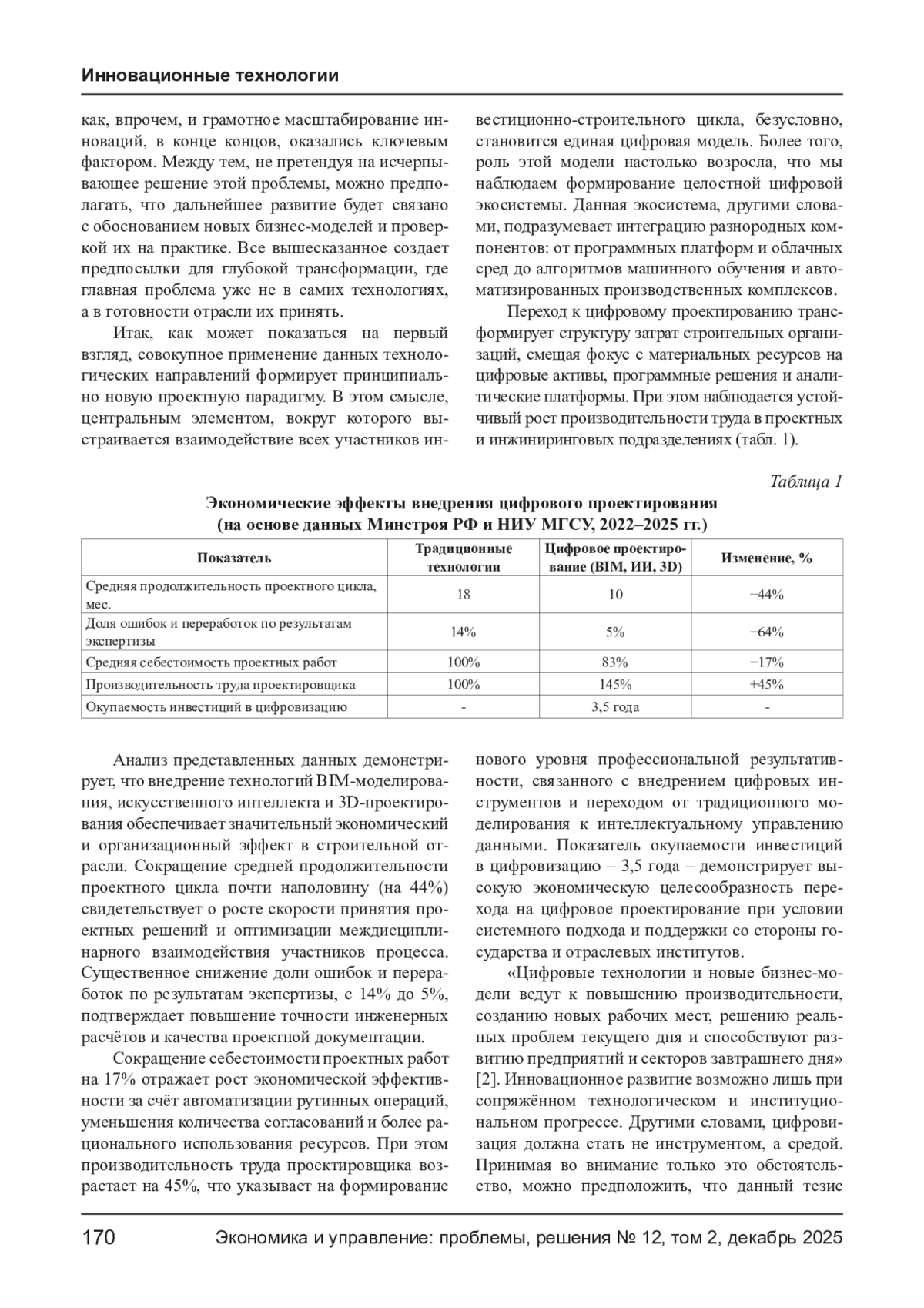 Современное развитие строительной отрасли, безусловно, происходит в условиях стремительной цифровой трансформации. Если обратиться к анализу источников [1-10], она затрагивает как производственные и управленческие процессы, так и логику проектной деятельности.