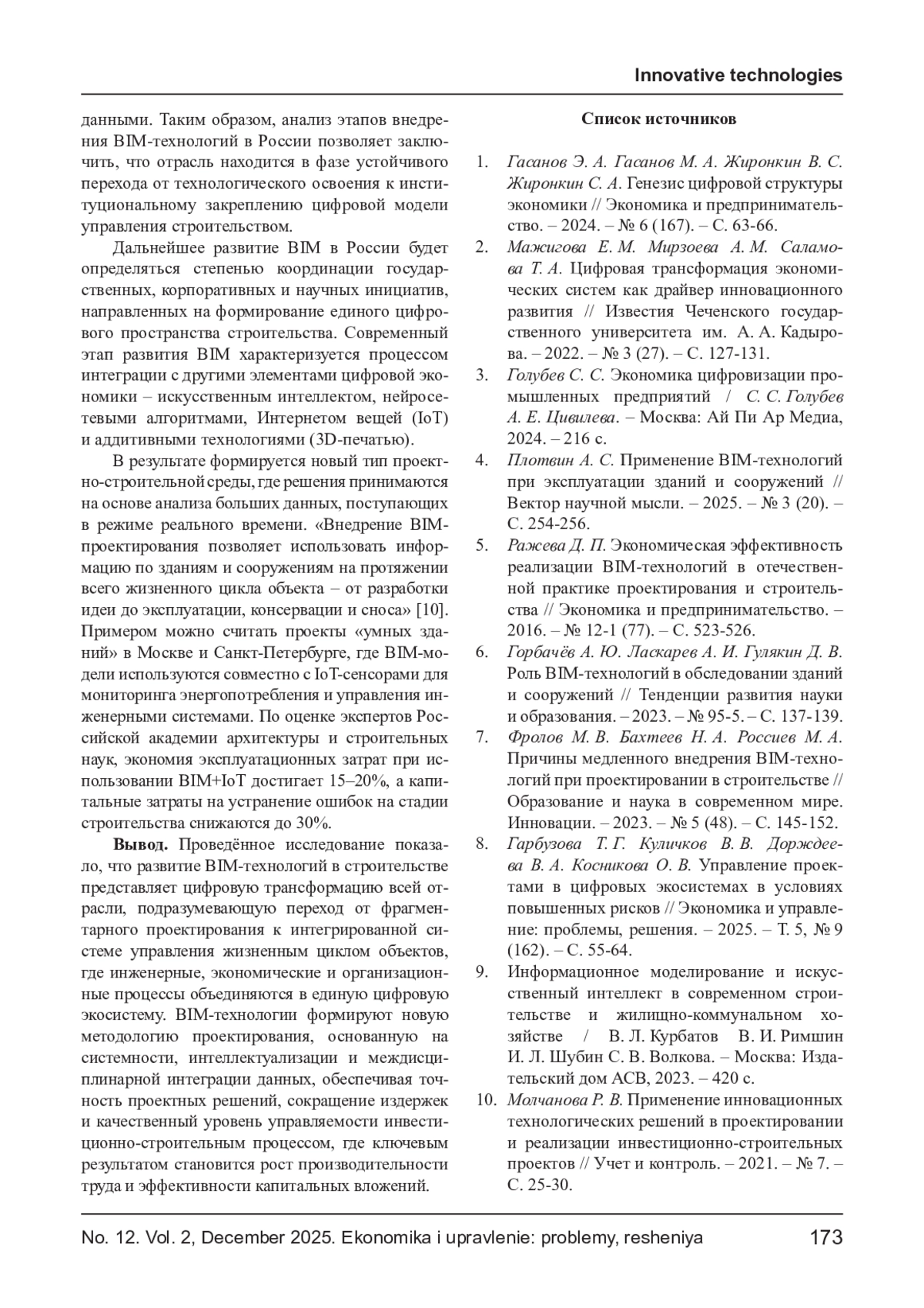 7. Фролов М. В. Бахтеев Н. А. Россиев М. А. Причины медленного внедрения BIM-технологий при проектировании в строительстве // Образование и наука в современном мире. Инновации. - 2023. - № 5 (48). - С. 145-152.