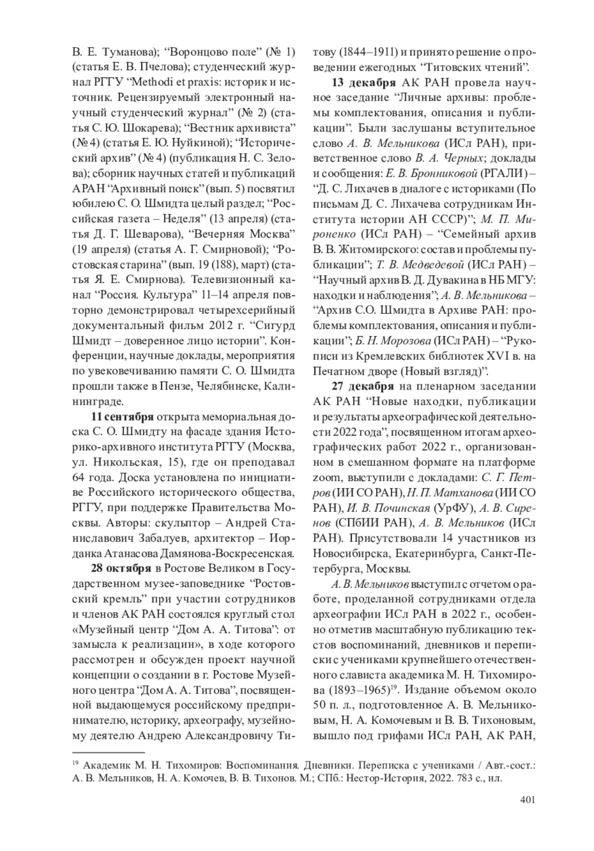 25. Академик М. Н. Тихомиров: Воспоминания. Дневники. Переписка с учениками / Авт.-сост.: А. В. Мельников, Н. А. Комочев, В. В. Тихонов. М., СПб.: Нестор-История, 2022. 783 с. EDN: DJVKMZ
