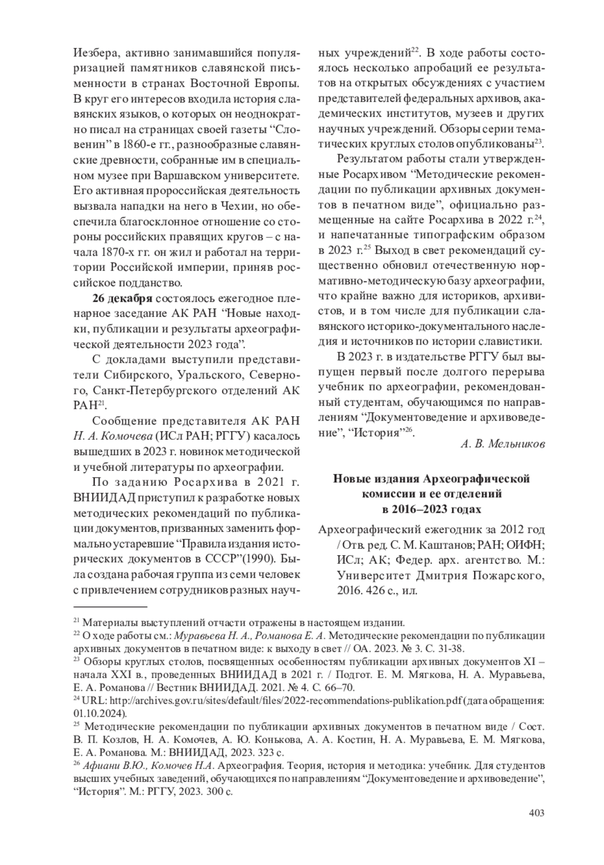30. Методические рекомендации по публикации архивных документов в печатном виде / Сост. В. И. Козлов, Н. А. Комочев, А. Ю. Конькова, А. А. Костин, Н. А. Муравьева, Е. М. Мягкова, Е. А. Романова. М.: ВНИИДАД, 2023. 323 с.