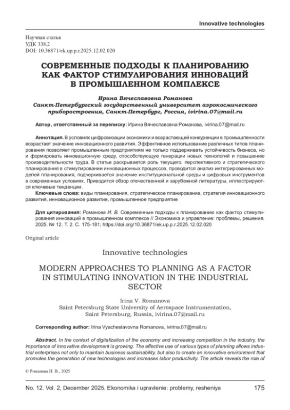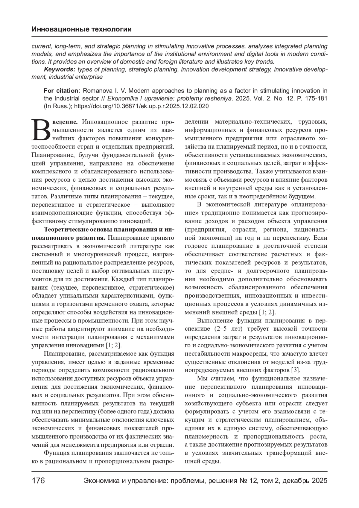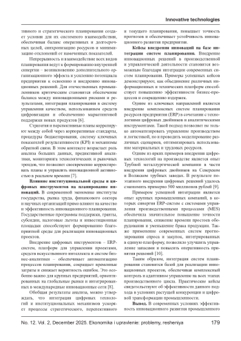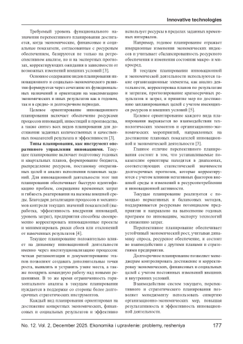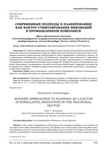 В условиях цифровизации экономики и возрастающей конкуренции в промышленности возрастает значение инновационного развития. Эффективное использование различных типов планирования позволяет промышленным предприятиям не только поддерживать устойчивость бизнеса, но и формировать инновационную среду, способствующую генерации новых технологий и повышению производительности труда. В статье раскрывается роль текущего, перспективного и стратегического планирования в стимулировании инновационных процессов, проводится анализ интегрированных моделей планирования, подчеркивается значение институциональной среды и цифровых инструментов в современных условиях. Приводится обзор отечественной и зарубежной литературы, иллюстрируются ключевые тенденции.