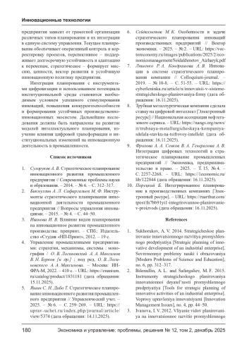 6. Сейдахметов М. К. Особенности и задачи стратегического планирования инноваций производственных предприятий // Вектор экономики. - 2025. - № 2. - URL: https://vectoreconomy.ru/images/publications/2025/2/economicsmanagement/Seidakhmetov_Aizharyk.pdf.