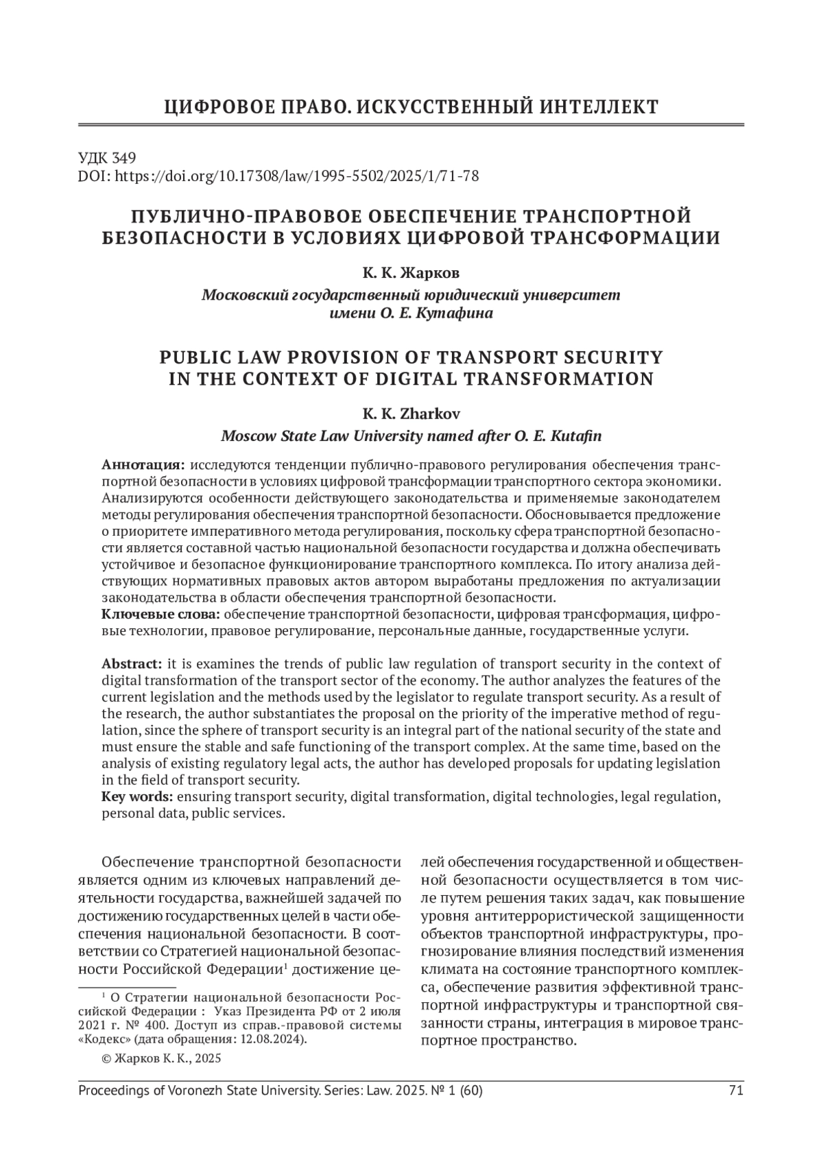 Исследуются тенденции публично-правового регулирования обеспечения транспортной безопасности в условиях цифровой трансформации транспортного сектора экономики. Анализируются особенности действующего законодательства и применяемые законодателем методы регулирования обеспечения транспортной безопасности. Обосновывается предложение о приоритете императивного метода регулирования, поскольку сфера транспортной безопасности является составной частью национальной безопасности государства и должна обеспечивать устойчивое и безопасное функционирование транспортного комплекса. По итогу анализа действующих нормативных правовых актов автором выработаны предложения по актуализации законодательства в области обеспечения транспортной безопасности.