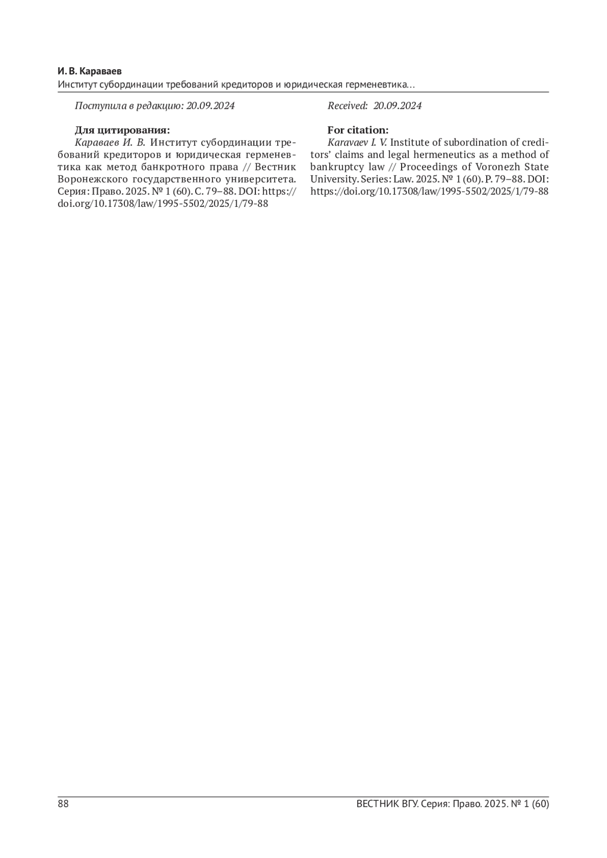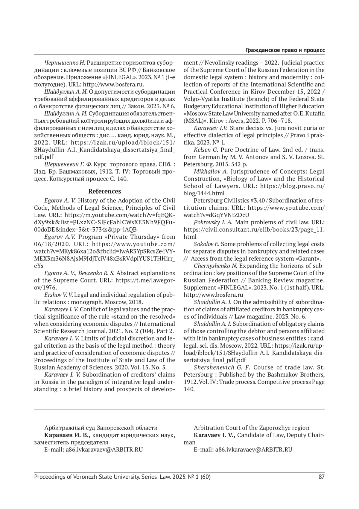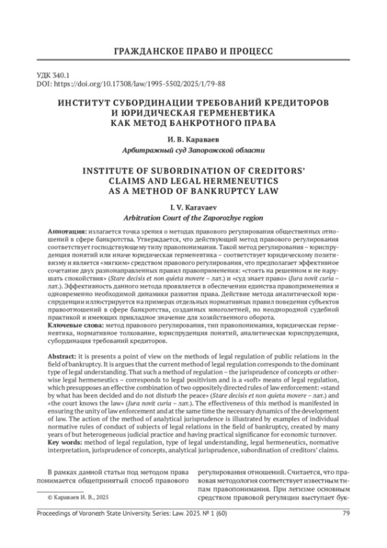 6. Караваев И. В. Субординация требований кредиторов в России в парадигме интегративного правопонимания: краткая история и перспективы развития // Неволинские чтения - 2022. Судебная практика Верховного Суда РФ в отечественной правовой системе: история и современность: сб. докладов Междунар. науч.-практ. конф. (г. Киров 15 декабря 2022 г.) / Волго-Вятский институт (филиал) ФГБОУ ВО “Московский государственный юридический университет имени О. Е. Кутафина (МГЮА)”. Киров: Аверс, 2022. С. 706-718.