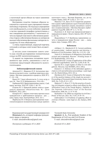 8. Рыженков А. Я. Зачет как юридический факт в гражданском праве // Власть Закона. 2021. № 3 (47). С. 59-70. EDN: URMYVG