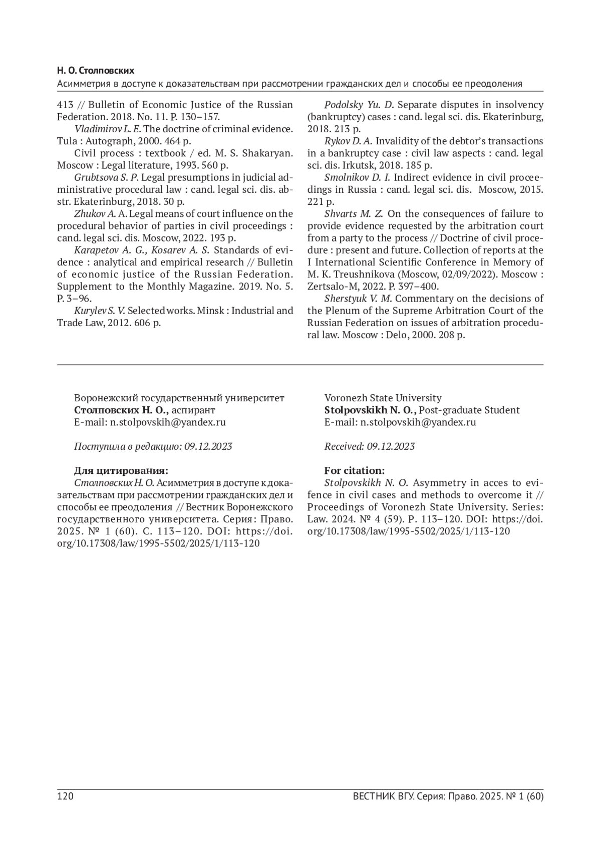 13. Смольников Д. И. Косвенные доказательства в гражданском судопроизводстве России: дис. канд. юрид. наук. М., 2015. 221 с. EDN: ZPYQEF