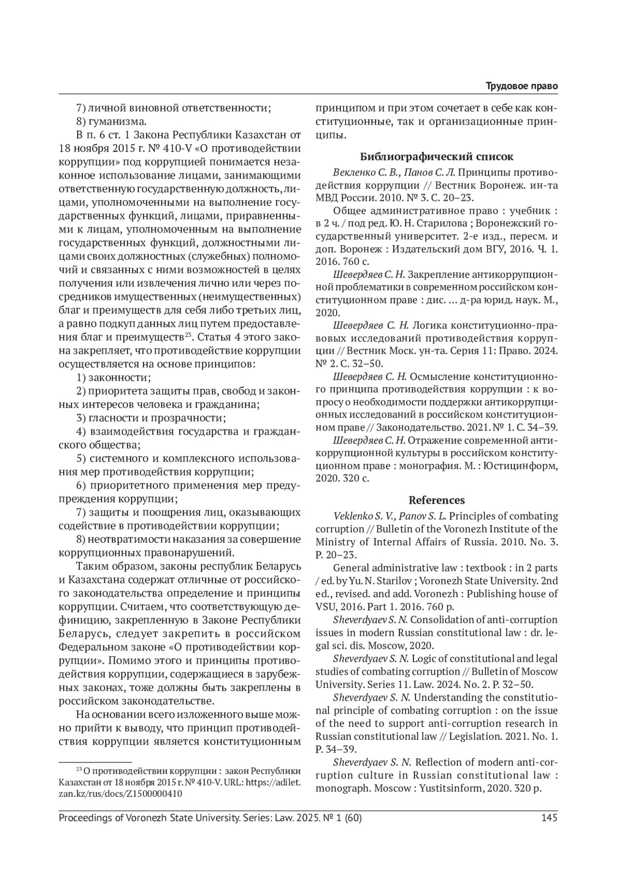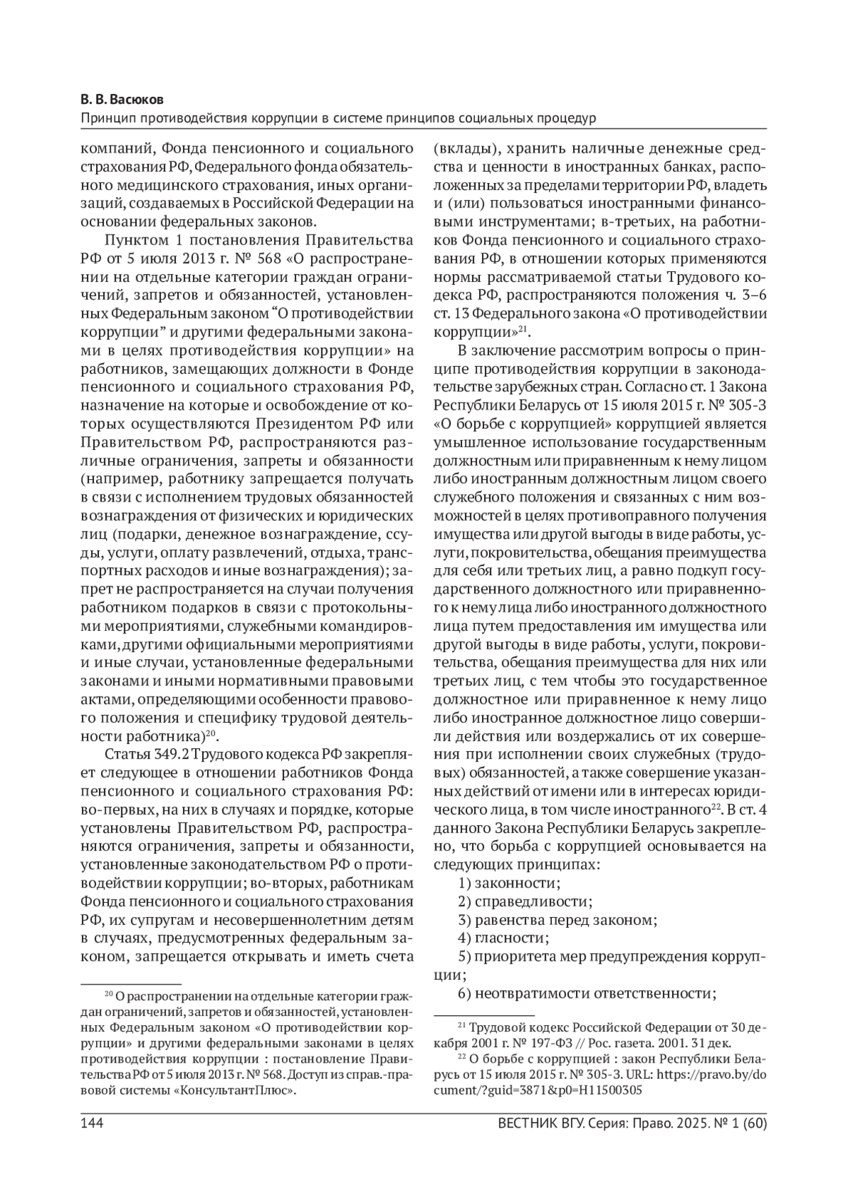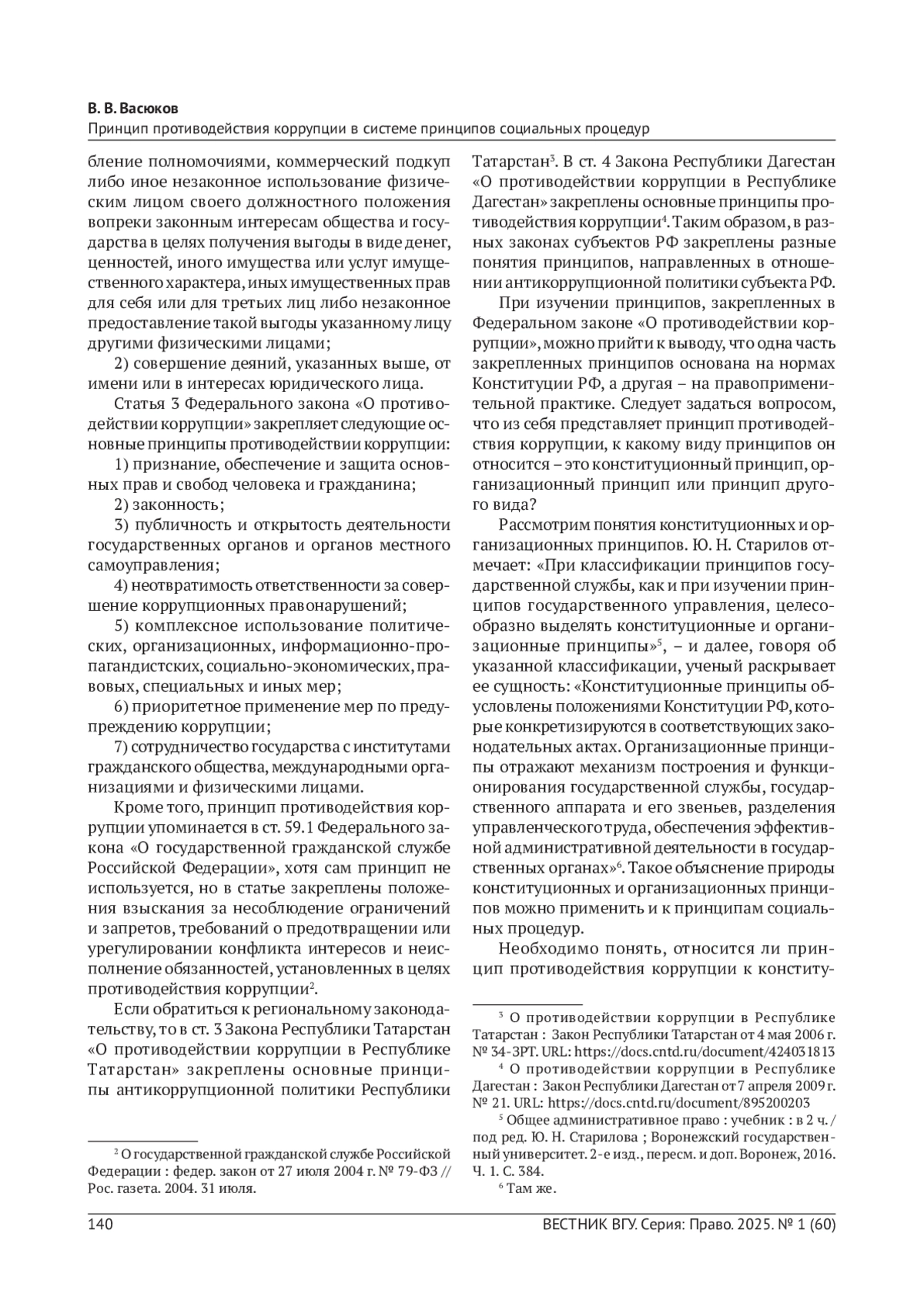 ВАСЮКОВ В.В. ПРИНЦИП ПРОТИВОДЕЙСТВИЯ КОРРУПЦИИ В СИСТЕМЕ ПРИНЦИПОВ СОЦИАЛЬНЫХ ПРОЦЕДУР // ВЕСТНИК ВОРОНЕЖСКОГО ГОСУДАРСТВЕННОГО УНИВЕРСИТЕТА. СЕРИЯ: ПРАВО. 2025. № 1 (60)