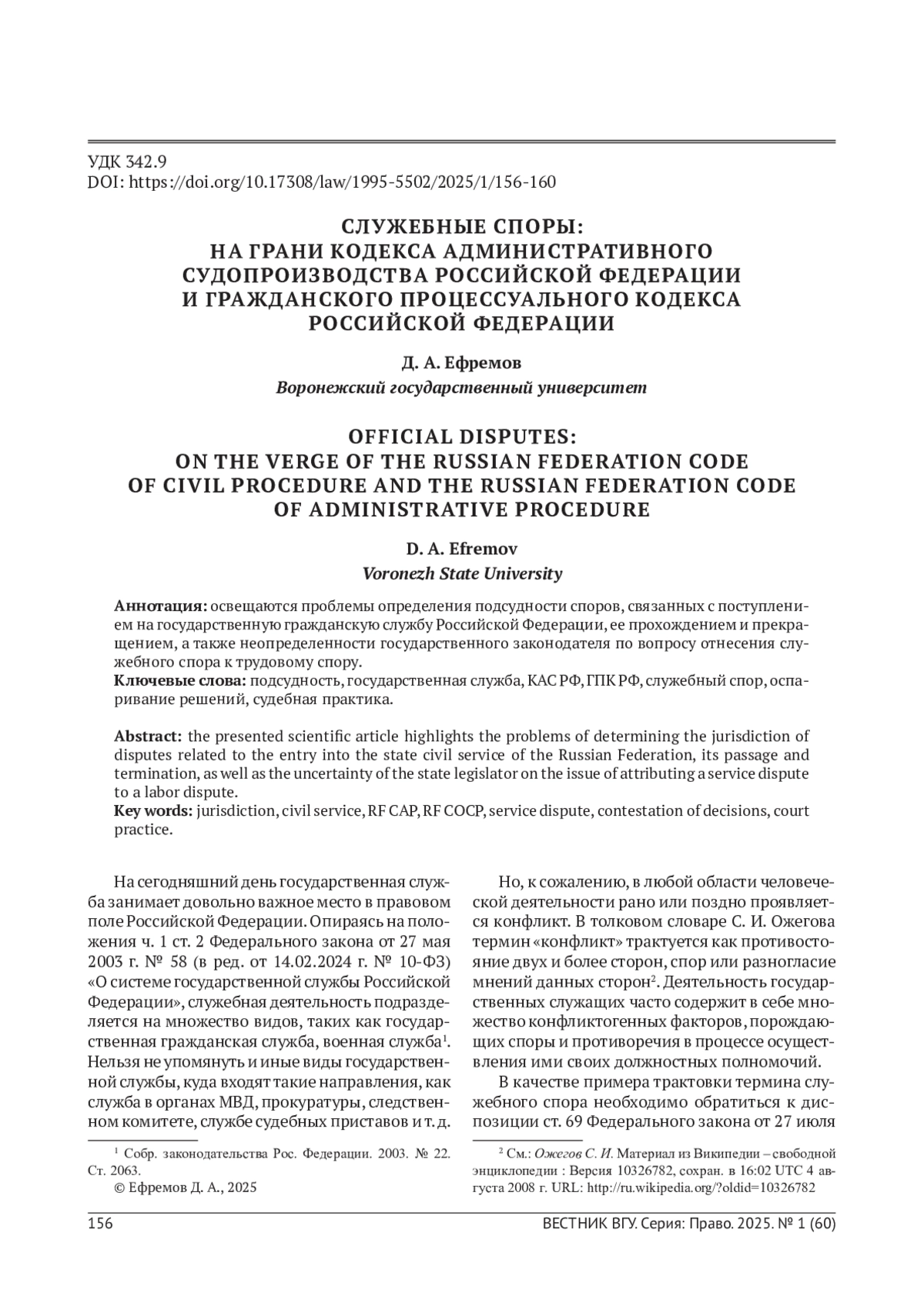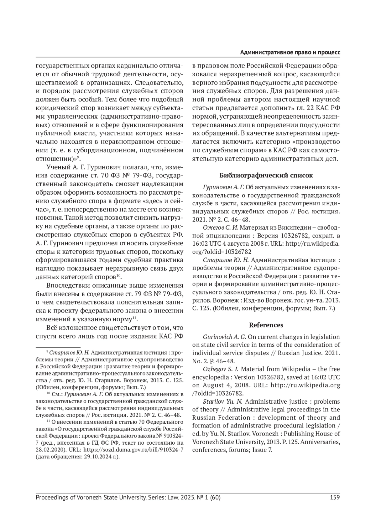 1. Гуринович А. Г. Об актуальных изменениях в законодательстве о государственной гражданской службе в части, касающейся рассмотрения индивидуальных служебных споров // Рос. юстиция.2021. № 2. С. 46-48.
