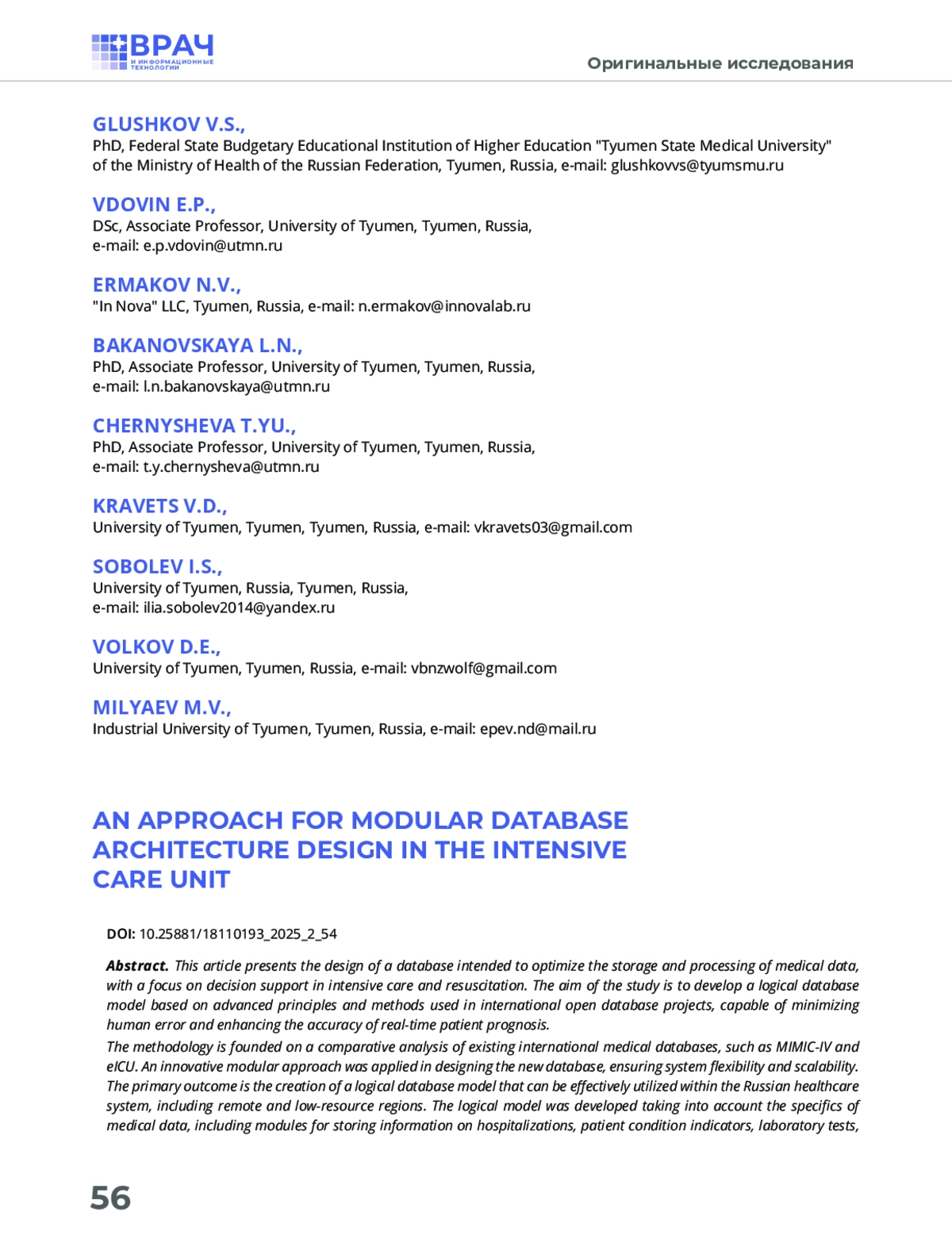 Методология работы основана на сравнительном анализе существующих международных медицинских баз данных, таких как MIMIC-IV и eICU. Для проектирования новой базы данных применен инновационный модульный подход, который обеспечивает гибкость и масштабируемость системы.