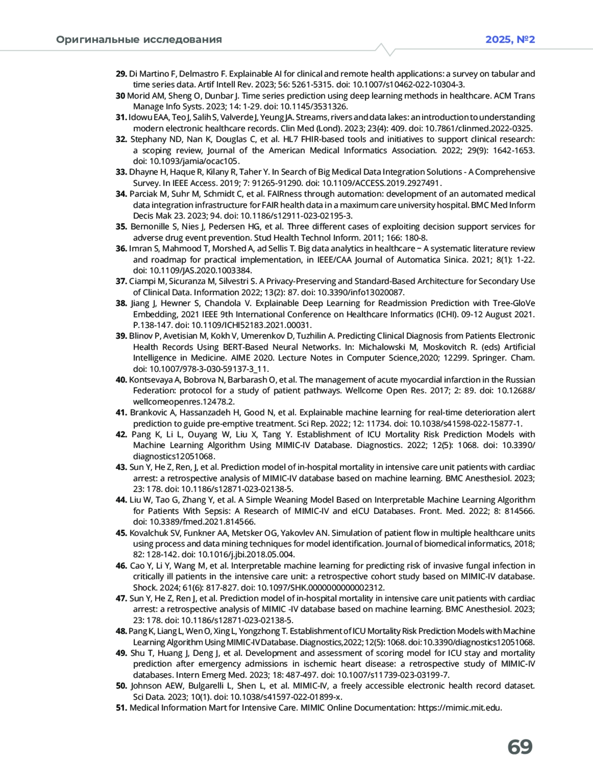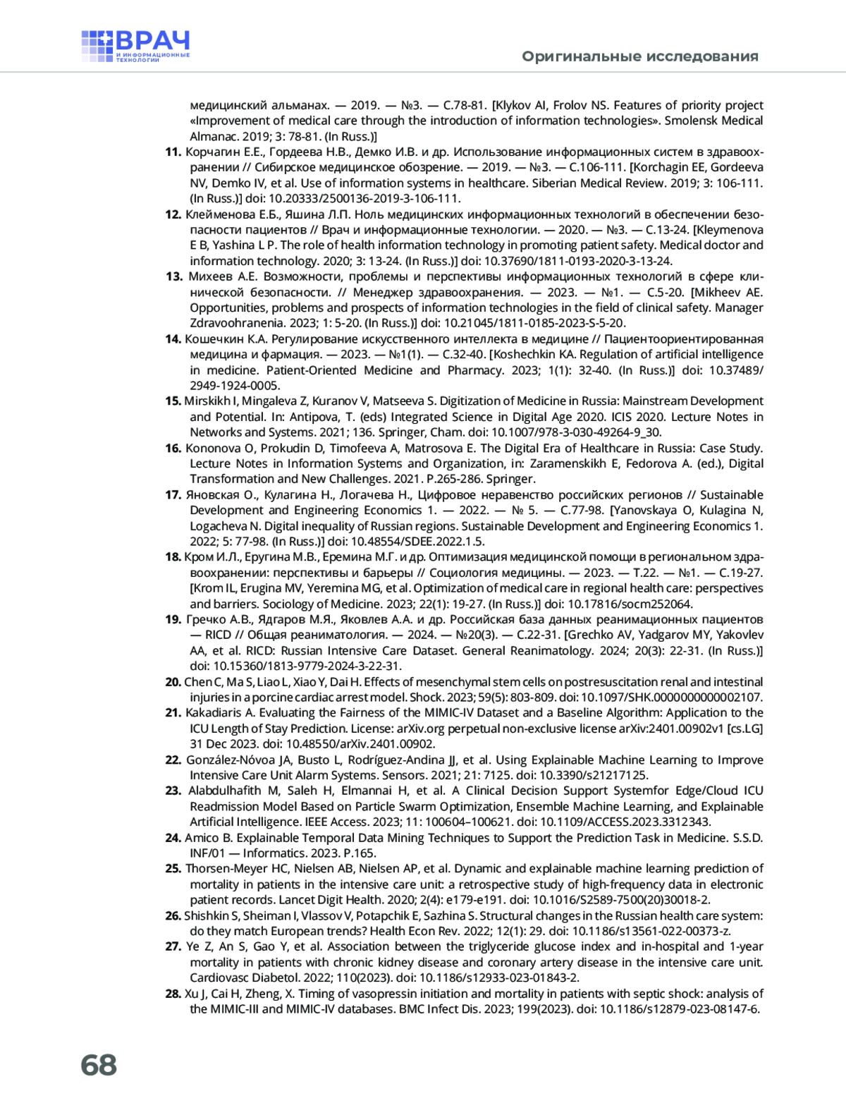 5. Романюк Т.И., Поздняков Д.Ю., Мушенок Ф.Б. Использование возможностей машинного обучения и искусственного интеллекта в отделениях анестезиологии и реанимации // Врач и информационные технологии. - 2021. - № 2. - С. 60-71. doi: 1025881/18110193_2021_2_60.