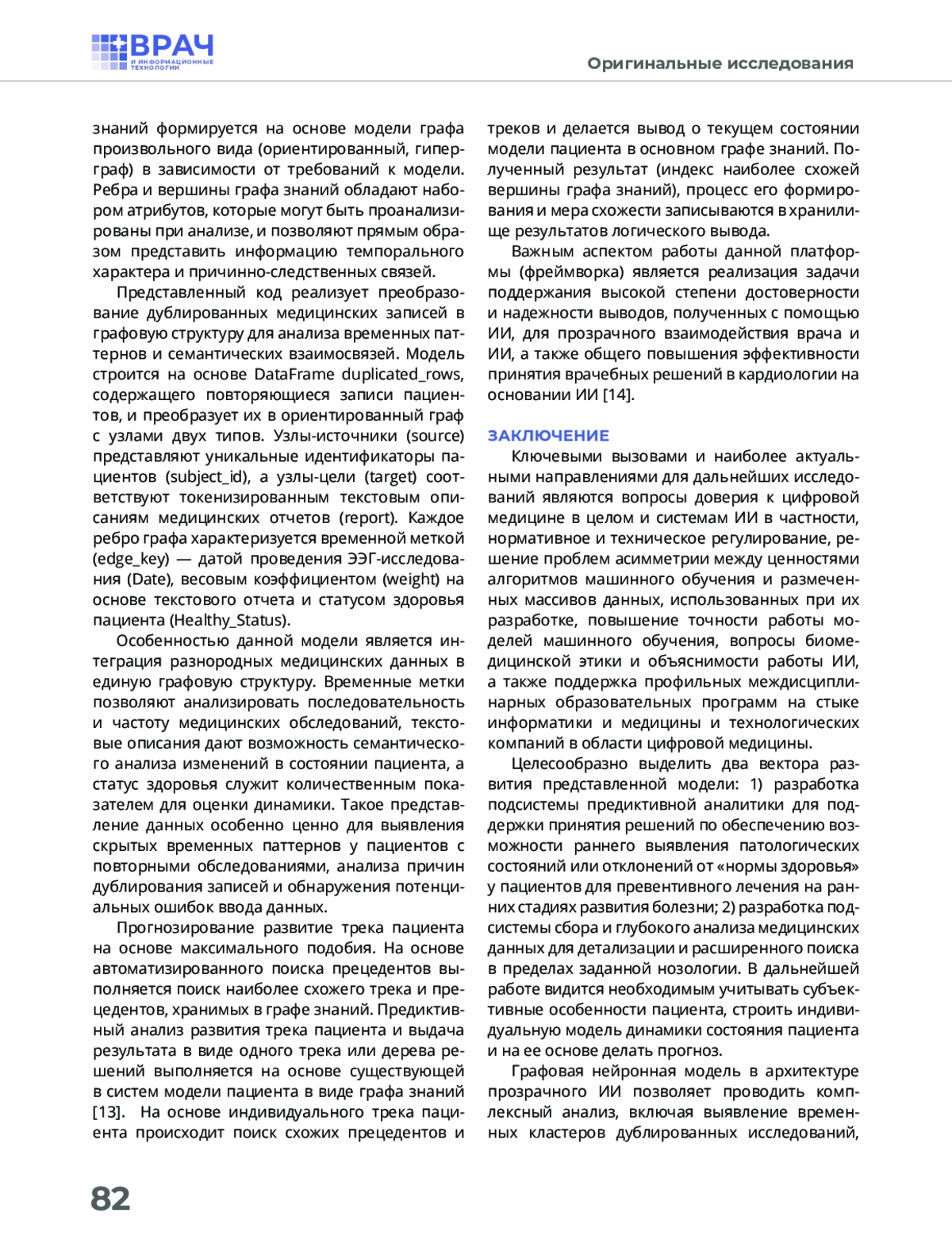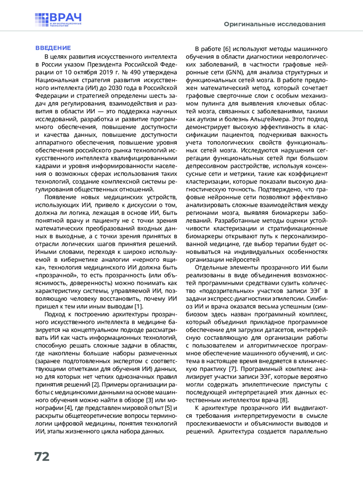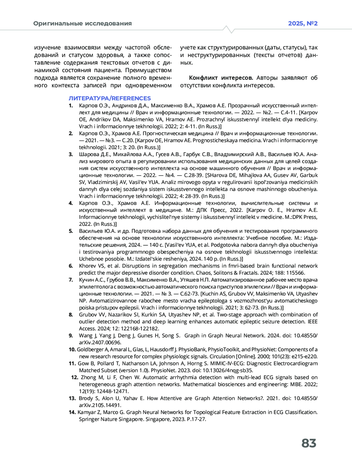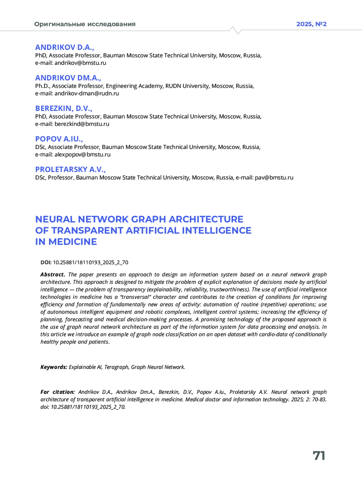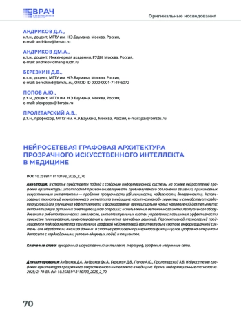 АНДРИКОВ Д.А., БЕРЕЗКИН Д. В., ПОПОВ А.Ю., ПРОЛЕТАРСКИЙ А. В. НЕЙРОСЕТЕВАЯ ГРАФОВАЯ АРХИТЕКТУРА ПРОЗРАЧНОГО ИСКУССТВЕННОГО ИНТЕЛЛЕКТА В МЕДИЦИНЕ // ВРАЧ И ИНФОРМАЦИОННЫЕ ТЕХНОЛОГИИ. 2025. № 2