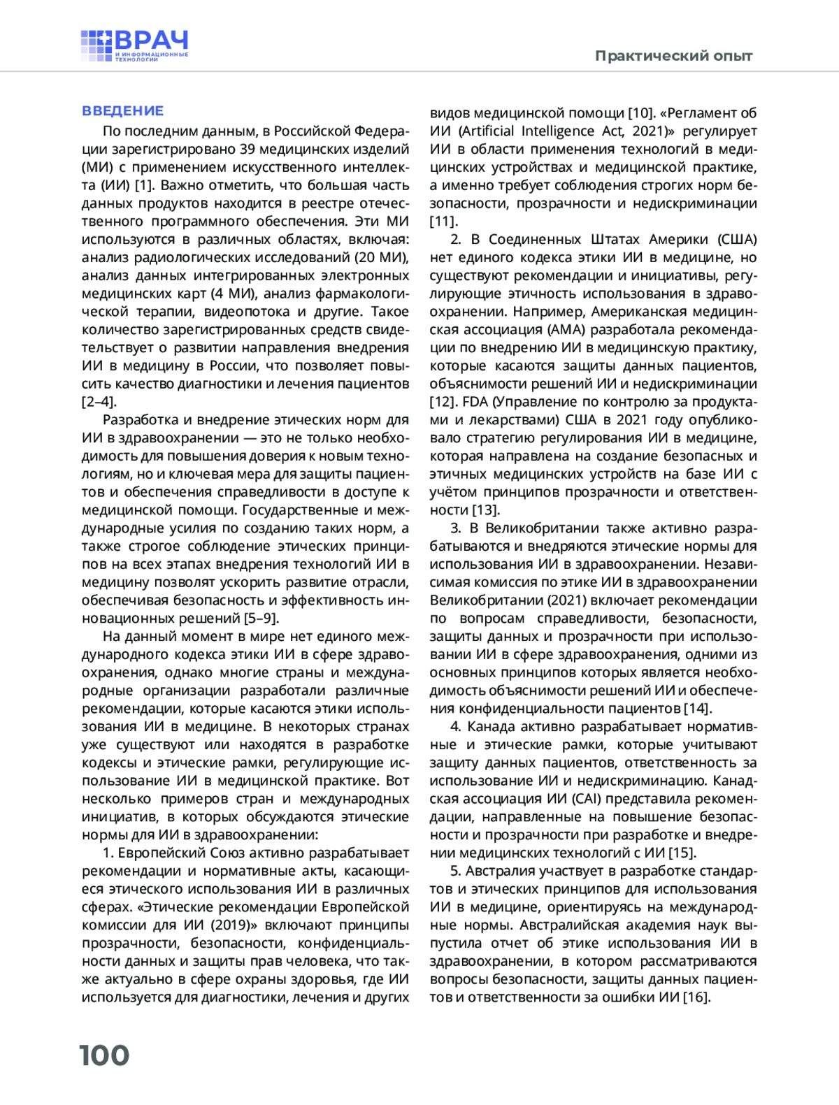 5. Хохлов А.Л., Зарубина Т.В., Котловский М.Ю. и др. Механизмы внедрения технологий искусственного интеллекта в здравоохранение: новые этические вызовы // Медицинская этика. - 2024. - Т. 12. - № 3. - С. 4-10. DOI: 10.24075/medet.2024.018