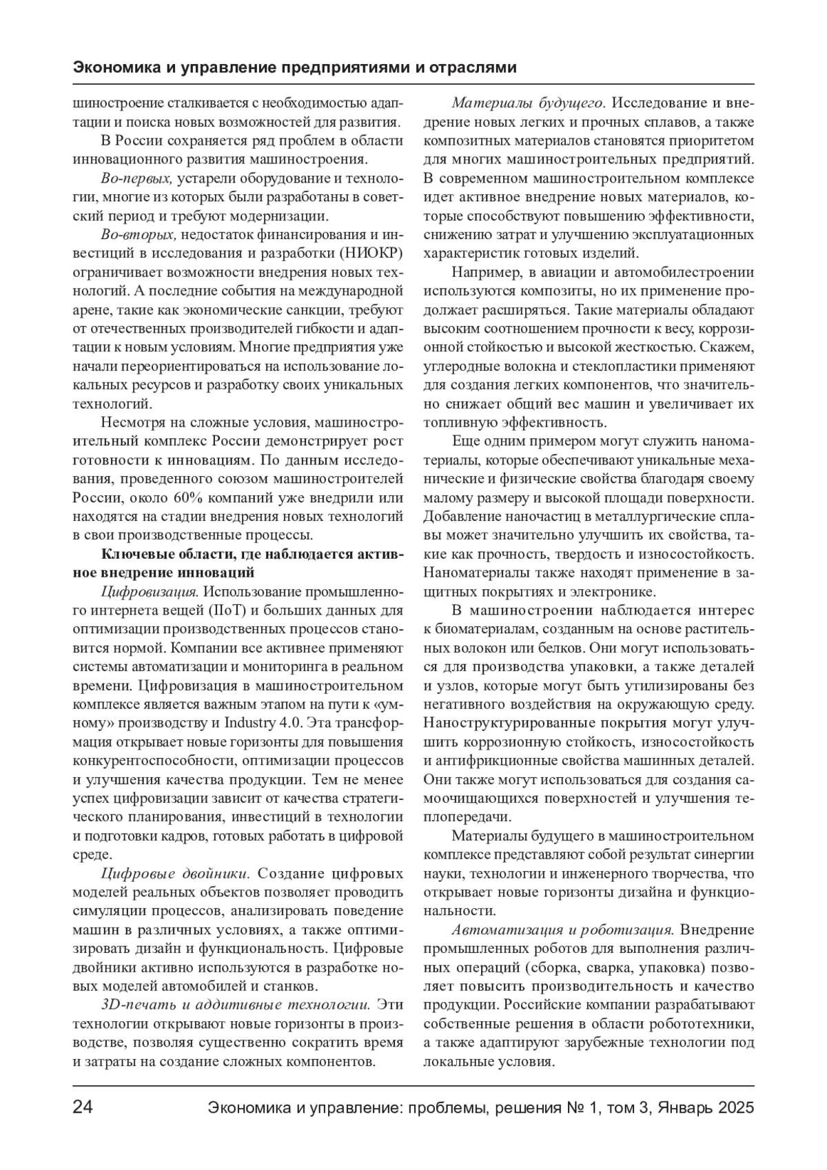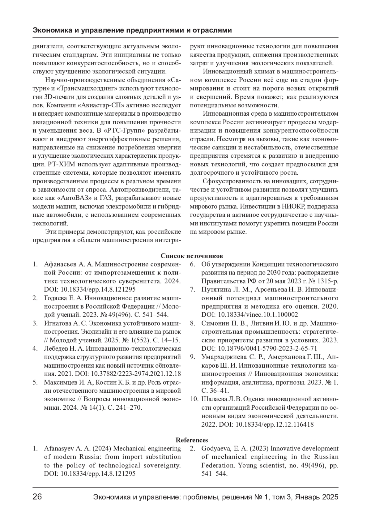1. Афанасьев А. А. Машиностроение современной России: от импортозамещения к политике технологического суверенитета. 2024. DOI: 10.18334/epp.14.8.121295